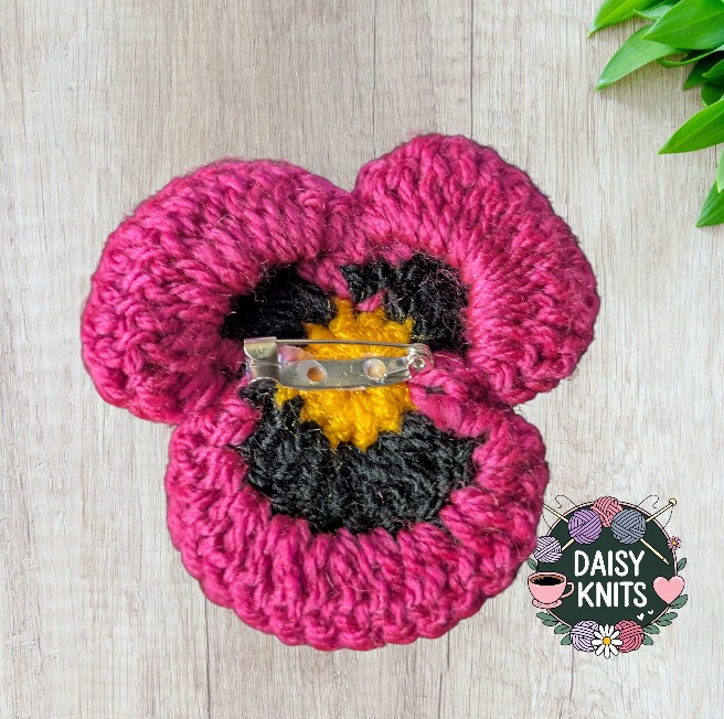 Enhance your outfit with our charming Hand Knitted Bright Pink Pansy Brooch. Perfect for adding a touch of elegance and uniqueness to your attire. (it is a hot pink in colour in real life!)