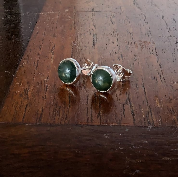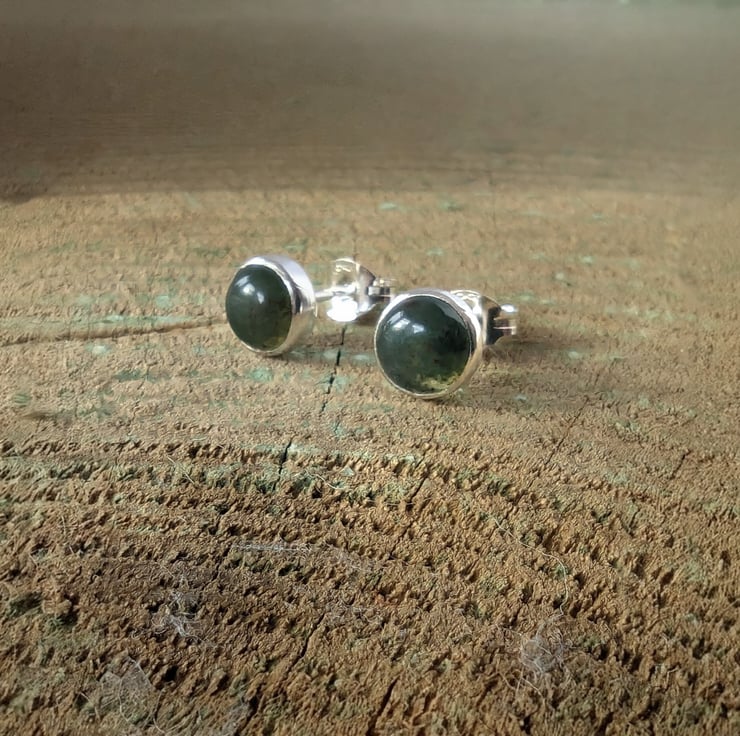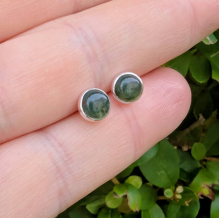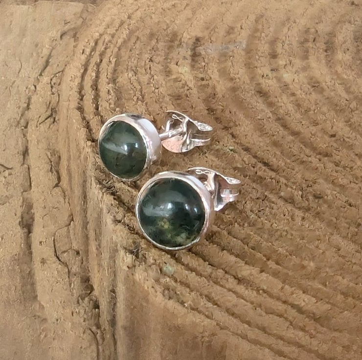 Small stud earrings set with natural moss agate stones their minimalist design makes them comfy and easy wearable adding a touch of natural beauty to your everyday style.