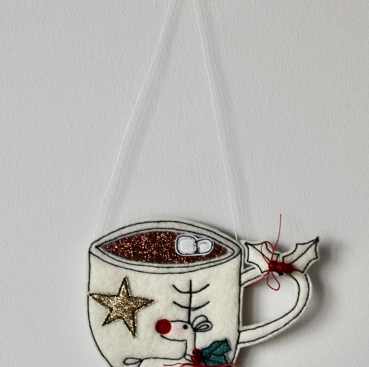 A delightful hanging decoration which is created using multiple layers of 100% wool felt, cotton cloth, glitter cloth, free hand machine embroidery and cut out by hand, using a very sharp pair of scissors. There are six red glass beads to finish off the holly on the handle and on the reindeer.