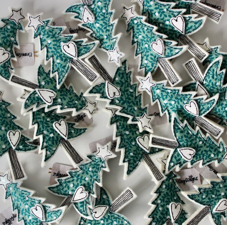 Tree brooches are sewn using cotton cloth, 100% wool felt and free hand machine embroidery; multiple layers of cloth are sewn together and cut out by hand using sharp scissors. The pins on the back are attached with hot glue with a sewn fabric rectangle to secure.