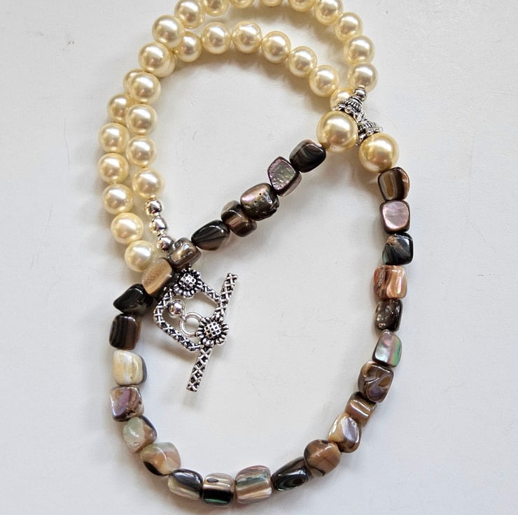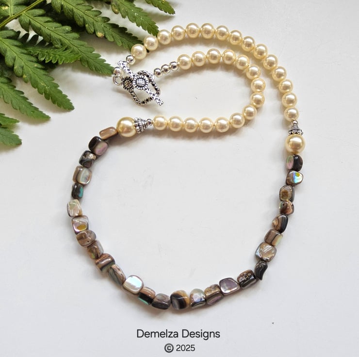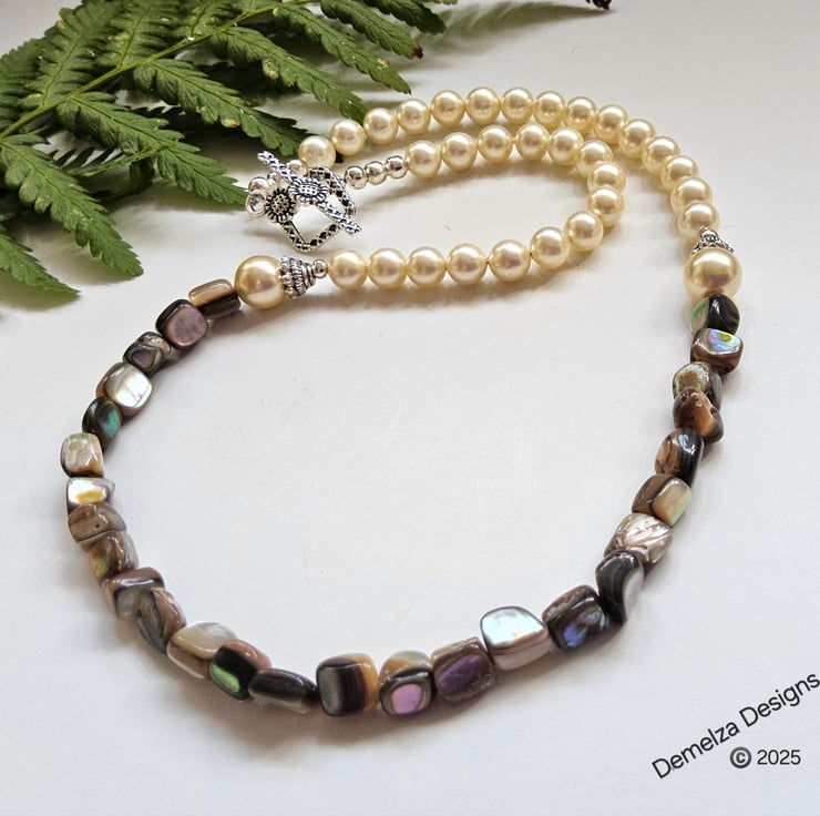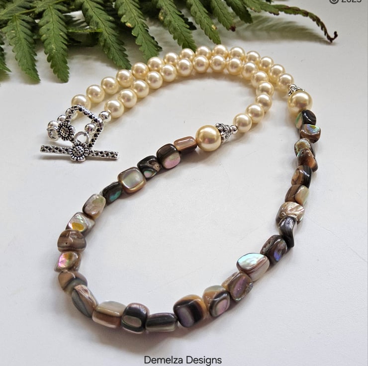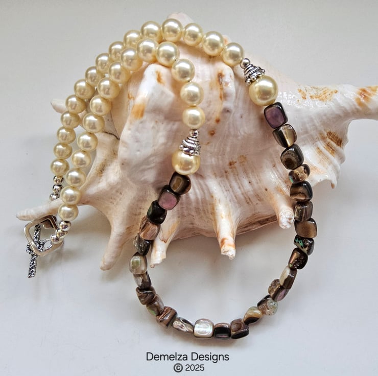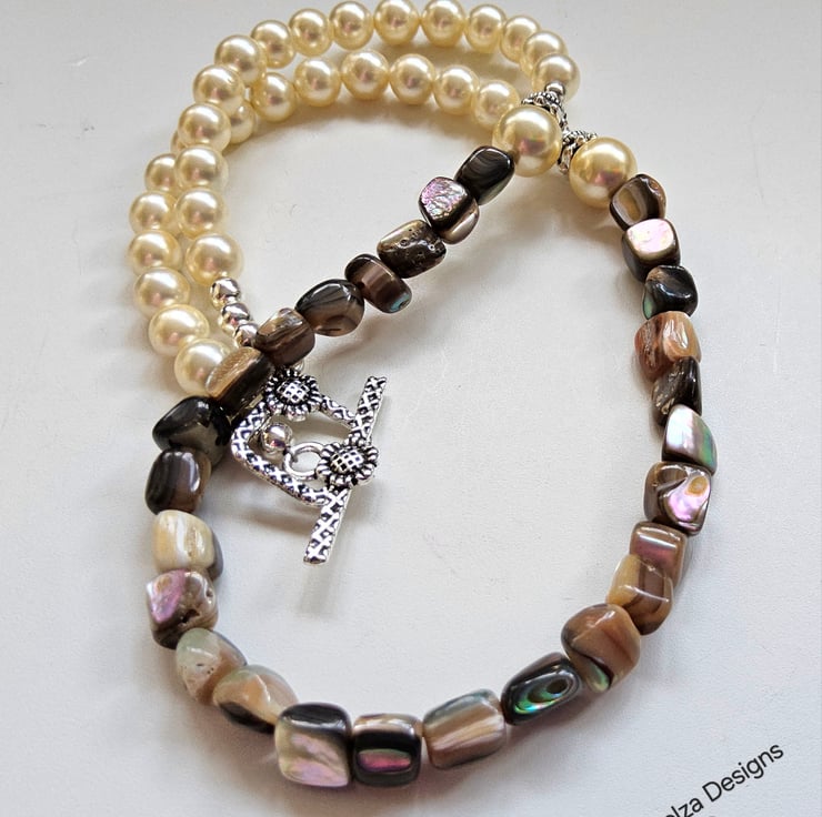 This unique necklace has been designed and hand crafted in Cornwall with love and care. In the centre are irregular cut smooth polished abolone nuggets measuring approximately 5mm x 5mm. To compliment them two 8mm shell pearls with tibetan silver beads add a touch of opulence. Following on 5mm cream shell pearls have been used to the back of the necklace.
