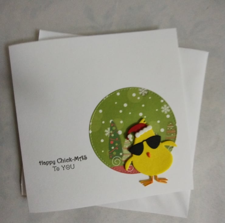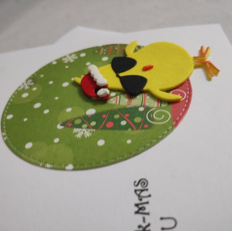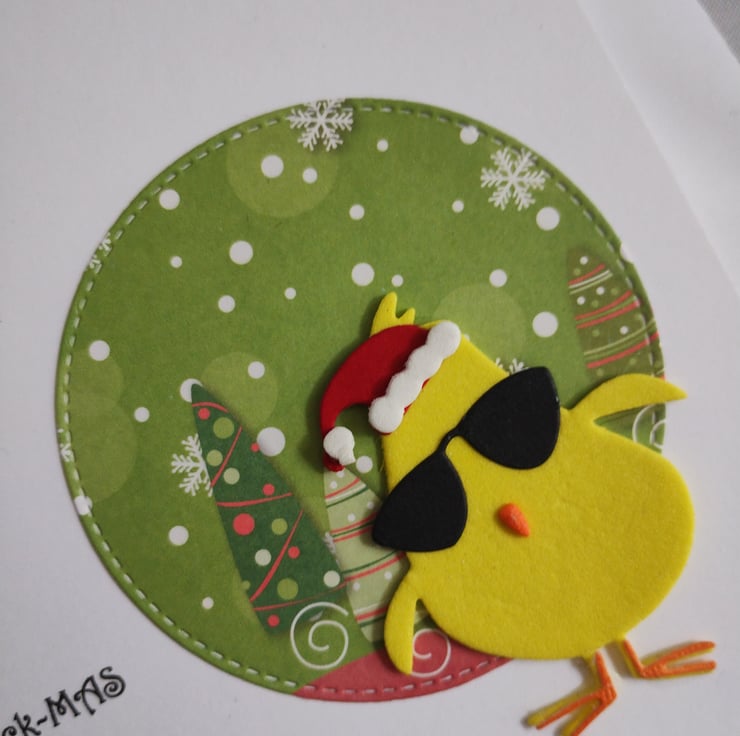 I've cut the cool cute chick from yellow foam, added sunnies and a Santa hat. There is a circle of patterned paper which features cute Christmas trees and the wording reads Happy CHICK-mas To You