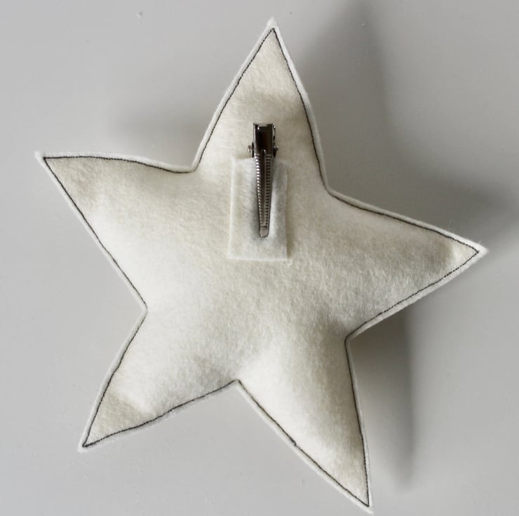 Little star is created using 100% cream wool felt and free hand machine embroidery; multiple layers of cloth are sewn together and cut out by hand using very sharp scissors. This star is lightly stuffed with soft toy filling and there is a crocodile clip attached to the back with hot glue and a felt rectangle to secure.