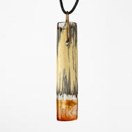 Hand crafted from reclaimed Sycamore wood and coloured resin this unique brooch is about 8cm long. The wood is a polished shard showing its unique black and cream colouring and the clear resin is tinged with red.