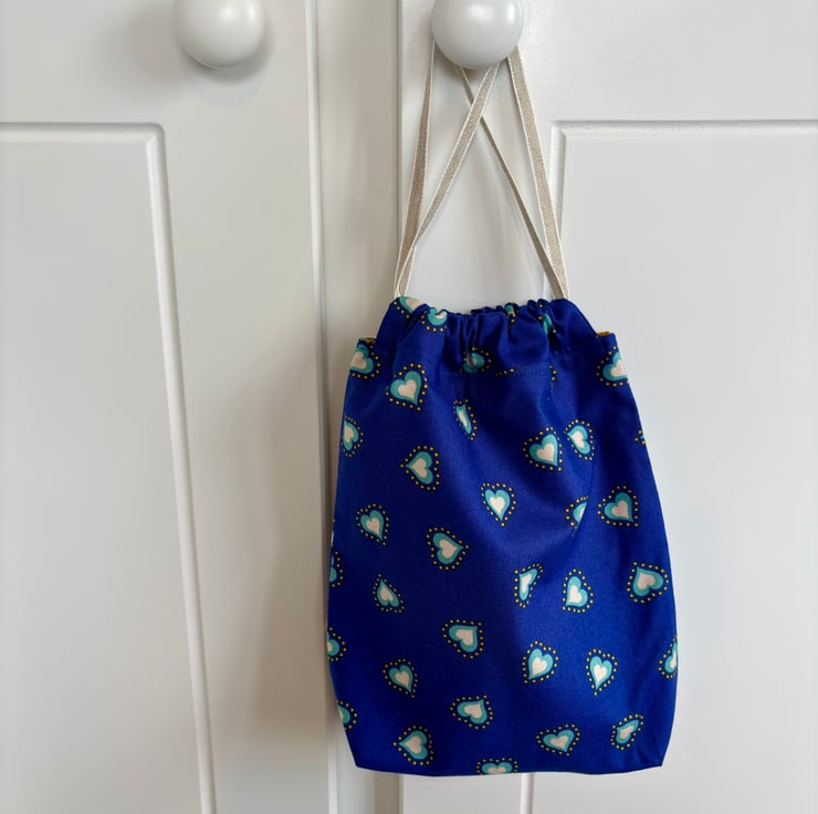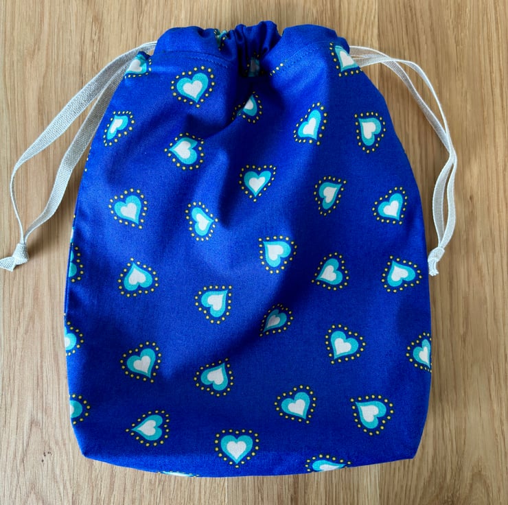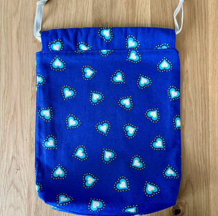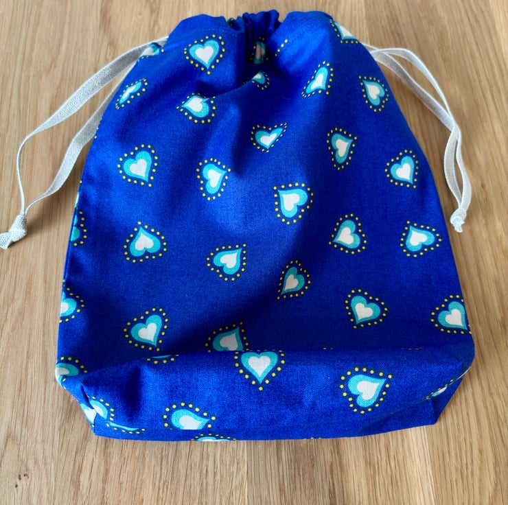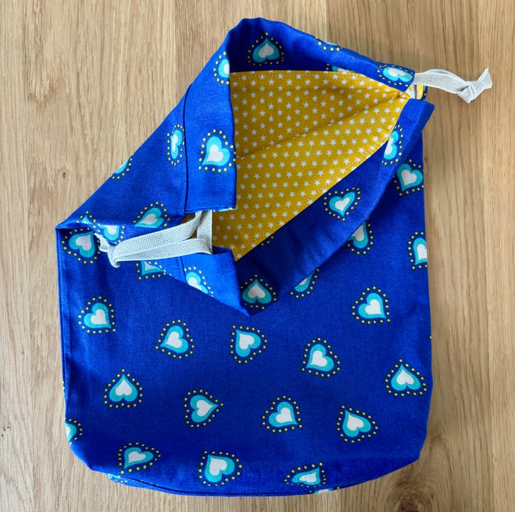 Handmade drawstring bag in bright royal blue with a fun print of jade and white hearts, surrounded by yellow dots. The bag is lined in bright yellow cotton with white stars. The bottom of the bag is boxed to give extra width and storage space.