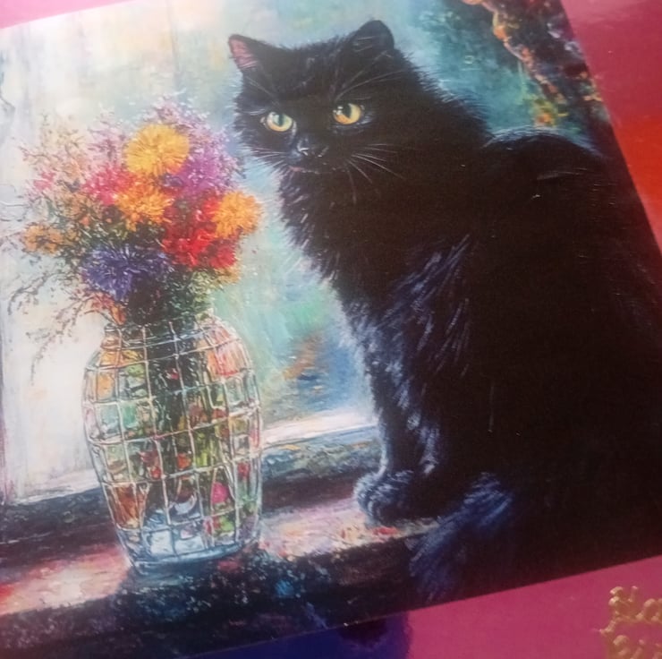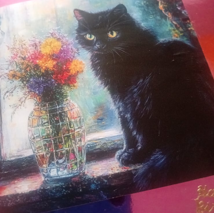 8-inch square card with envelope and wrapped in cellophane, this lovely card has a pink mirra base and a watercolour style decoration of a black cat sat by a vase of flowers. lovely big birthday card