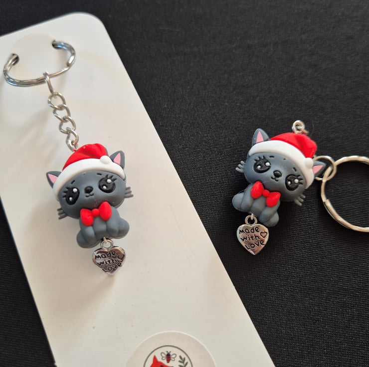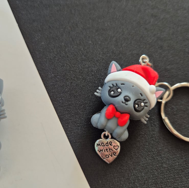 This cute cat wearing its christmas hat is made from silicone and has a little heart charm attached 'made with Love'