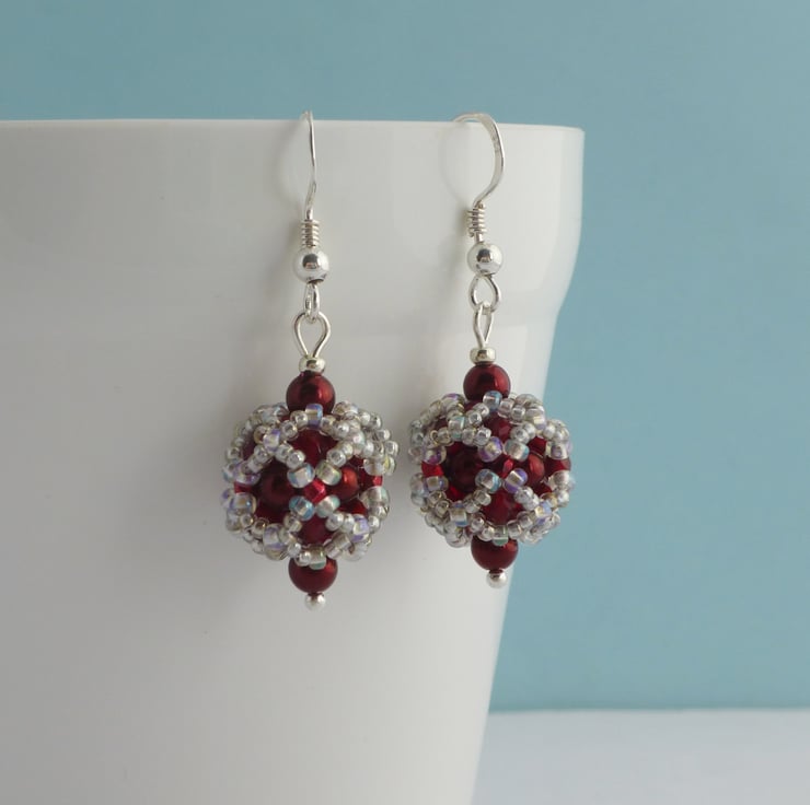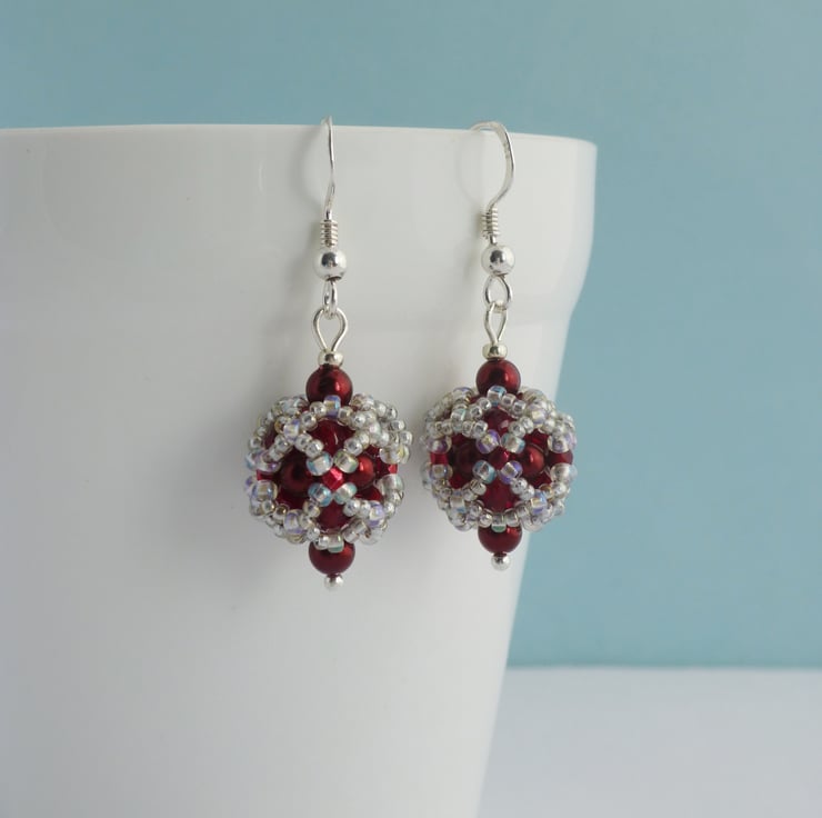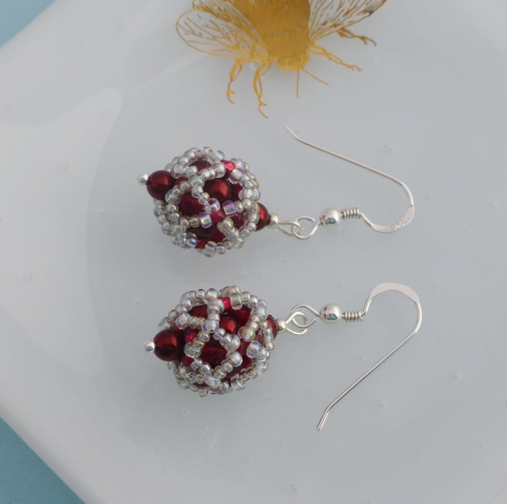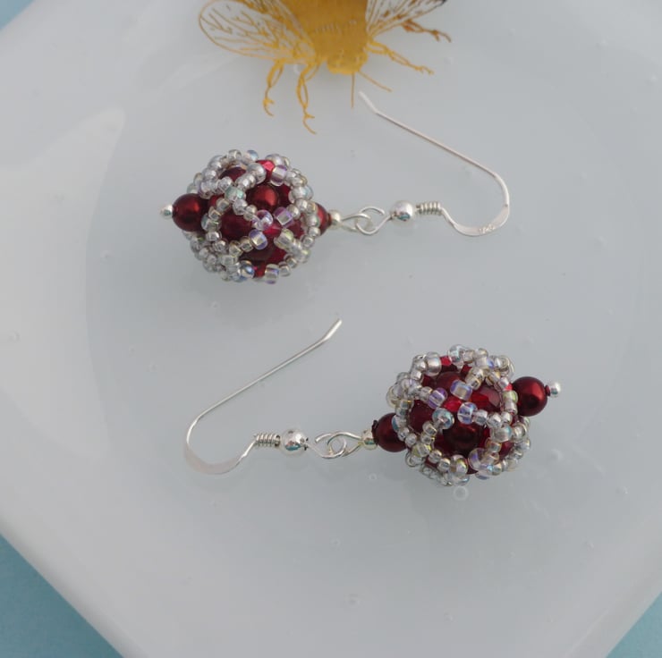 These beautiful hand beaded ball earrings are stitched from crystal glass pearls in a gorgeous dark metallic red colour. I used silver grey iridescent seed beads and faceted glass beads to finish them and to bring out the colour of the glass pearls. The ball section of the earrings is approx 1.5cm and they measure approx 2cm long from the bottom of the Sterling silver earwires.