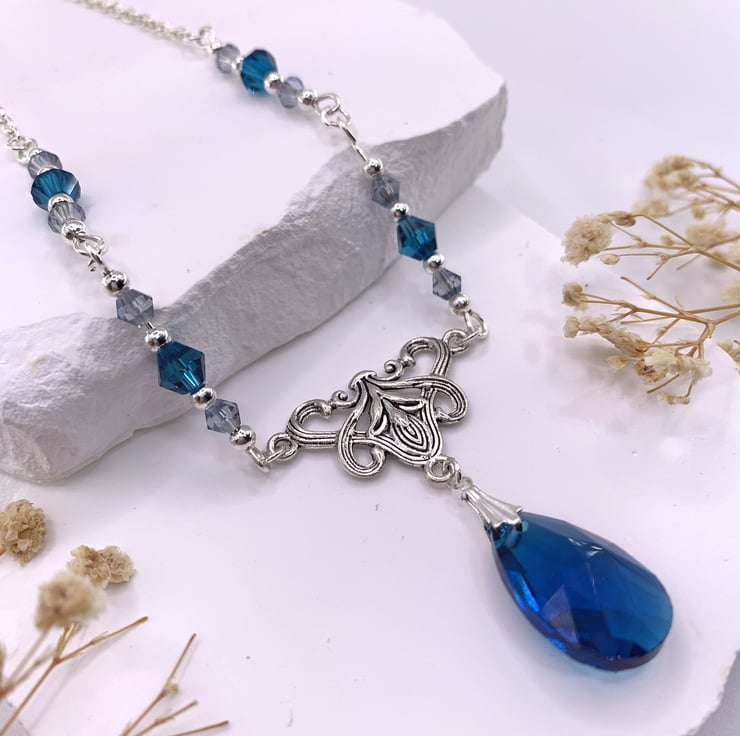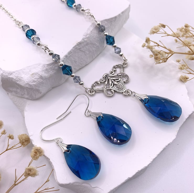 This pretty pendant necklace and earrings set is made in a vintage Edwardian style which features a lovely floral design silver-plated motif which has a teardrop blue glass crystal feature bead. The necklace includes tiny glass blue beads and silver plated beads. The necklace is finished with a silver plated chain and has a pair of matching glass crystal earrings.