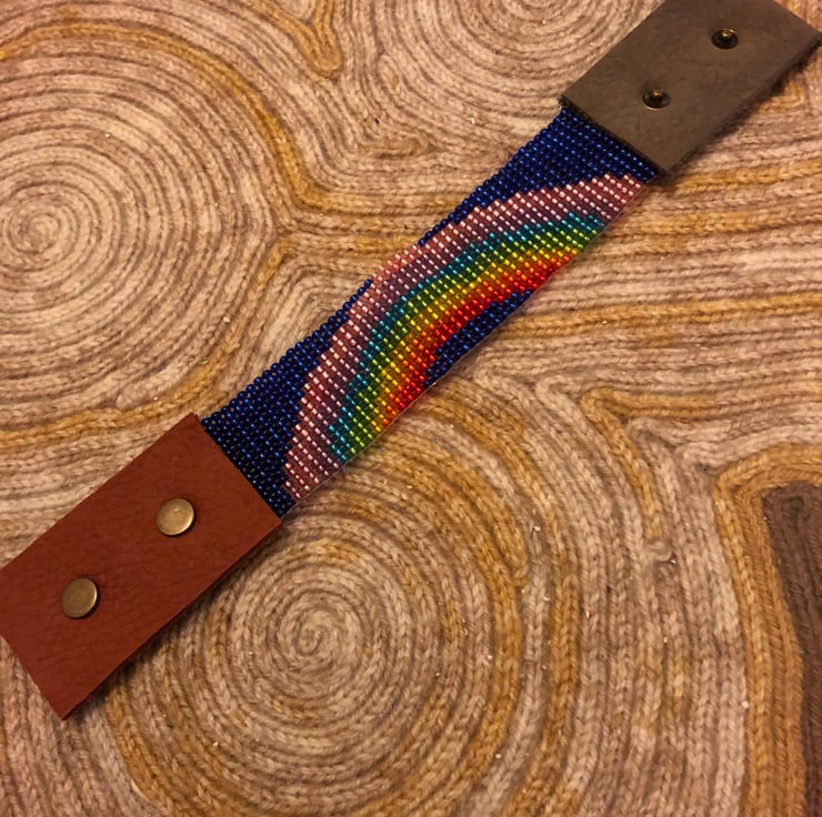 Glass bead bandweaving with rainbow design, fastened by metal studs on leather. Two settings of fastenings depending on width required. Medium size.