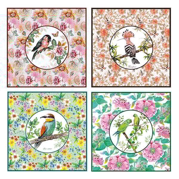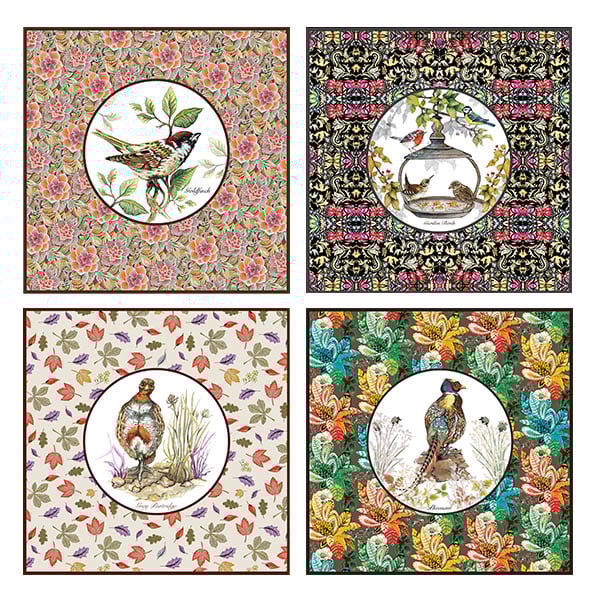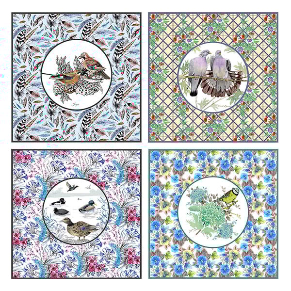 Birds in design are jays, wood pigeons, ducks, bluetit, bullfinch,hoopoe, bee-eater, parakeets, garden birds, goldfinch, grey partridge and pheasant.