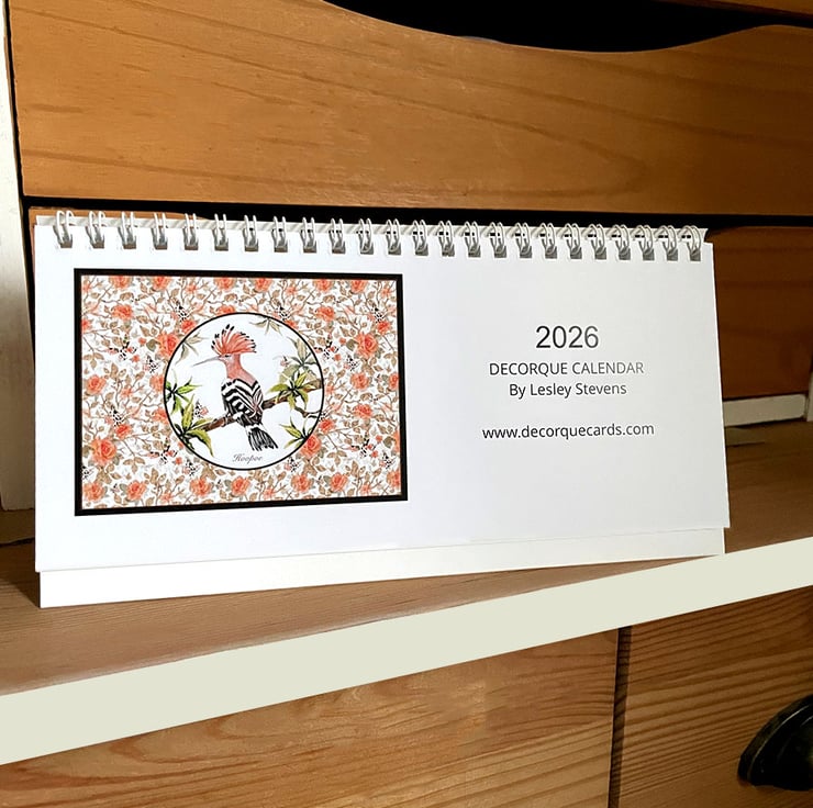 Looking for the perfect desk calender to keep you upto date? This free standing compact calender has 12 different designs one of each month. All these designs feature some of our beautiful wild birds, some that live here in the UK and others that may just visit on their way to warmer climes. Set in a circle they are surrounded by intricate patterns, all hand-painted designs from my extensive archive of work as a textile designer.