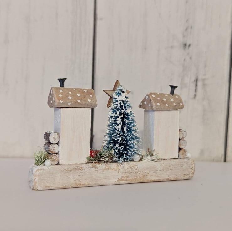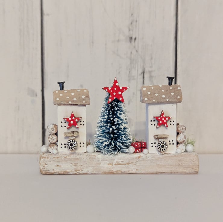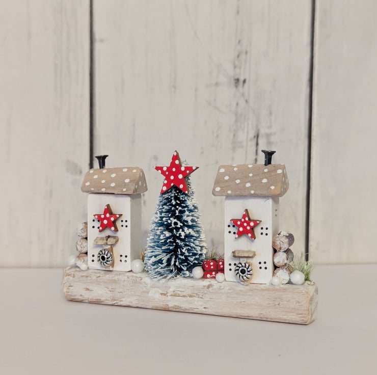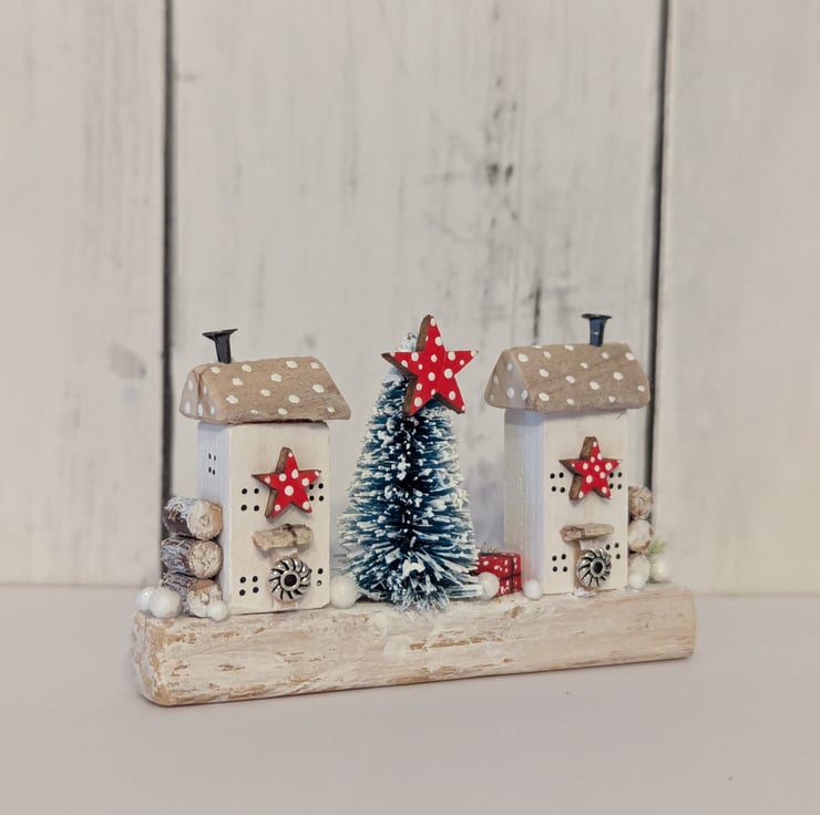 Two tiny cosy country cottages with a bead wreaths on the door, nail head chimneys and red and white polka dot stars.