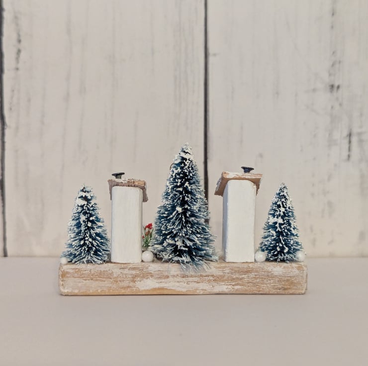 The scene is finished with three snowy Christmas trees, Christmas flower planter and shimmering snowballs on the ground.