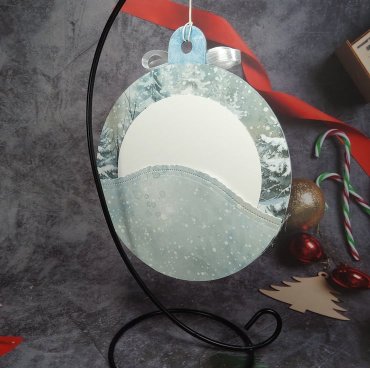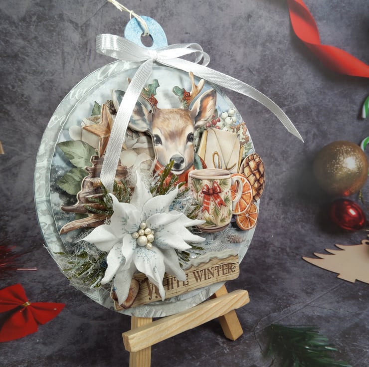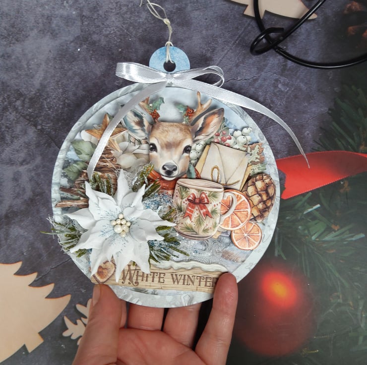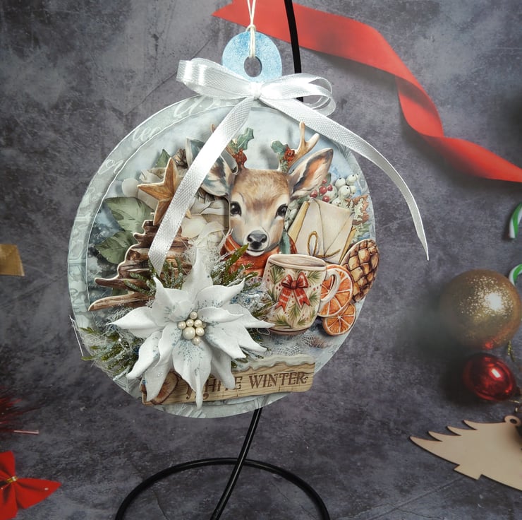 Add a cosy, woodland charm to your Christmas décor with this beautifully handcrafted ornament. The design features an adorable winter deer surrounded by festive details – a mug of cocoa, pinecones, and frosty greenery – all highlighted with a soft poinsettia flower and satin ribbon bow. A perfect addition to your tree or as a lovely seasonal home accent.