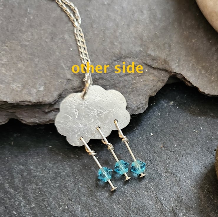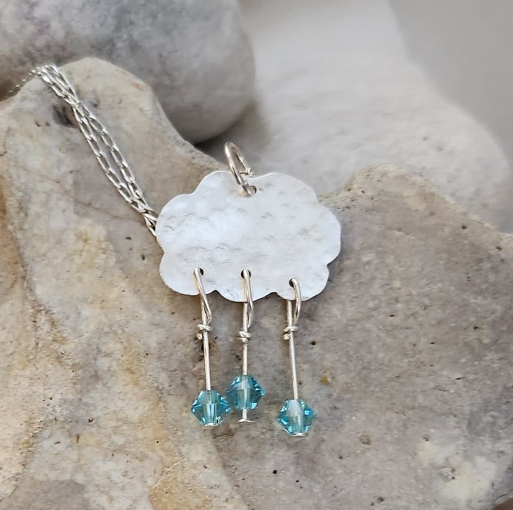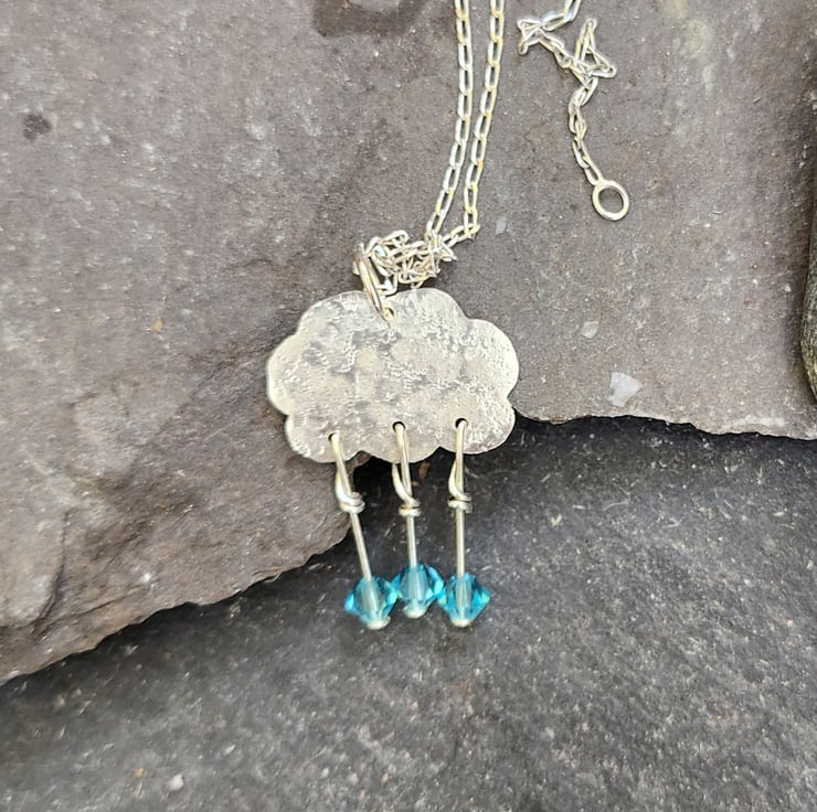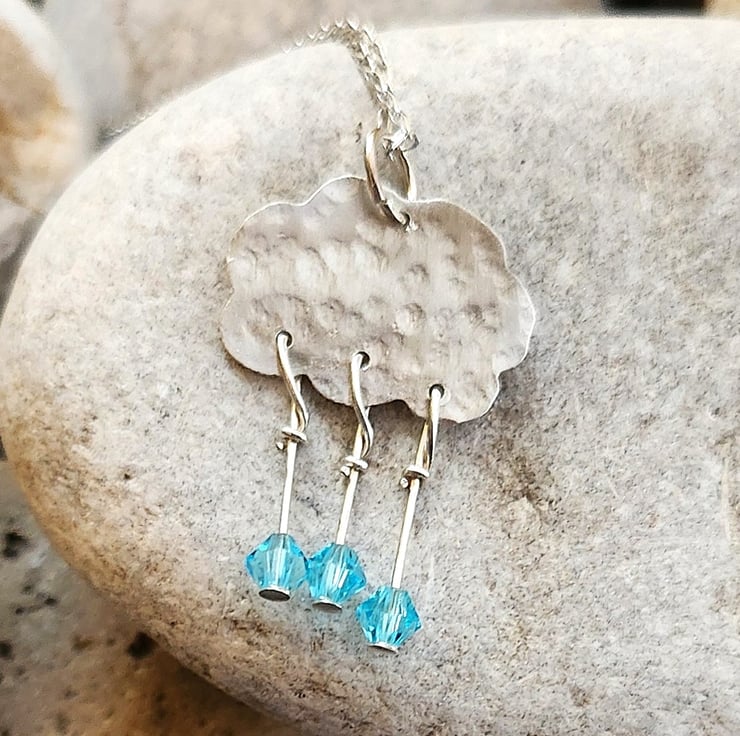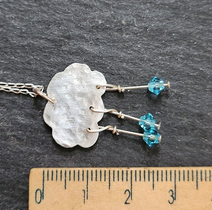 A cloud pendant in textured sterling silver. Three blue crystal crystal raindrops hang on sterling silver headpins. Measures approximately 27mm x 18mm including the raindrops. Includes a sterling silver chain, 16 or 18 inches, you choose.