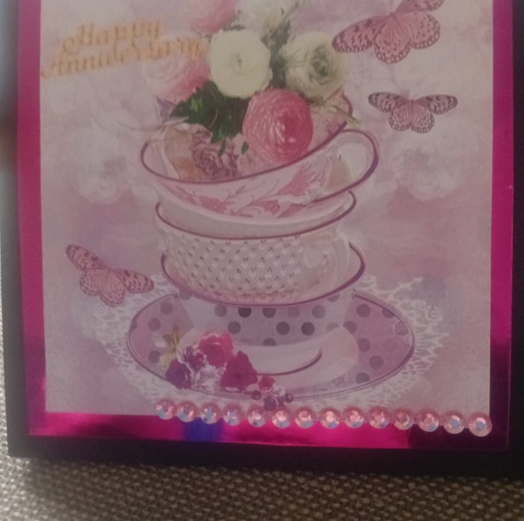 floral stacked tea cups with butterflies on this lovely easel card. Wishes Happy Anniversary. Mirra card pink edging on a black card., comes with an envelope and cellophane wrapping