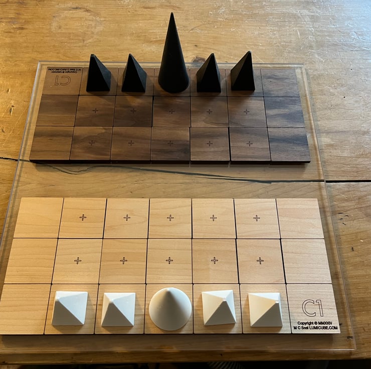 C1 (or Cone) is a game for the lovers of chess and other strategy board games, with few rules, and a great many possibilities. In C1, each player controls 1 Cone, 4 Pyramids and 10 Tiles, in a duel to capture a Cone. With a creative twist to the form, the playing pieces are all immortal while the play space itself shifts and gradually disappears. This offers a new landscape of possibilities where new strategies and logic can flourish.