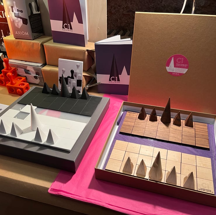 My C1 game draws its primary inspiration from my previous geometric-based games, specifically ALTAR and AXIOM, and from traditional chess-style mechanics. A central design idea comes from the concept of a playing surface that is not static, The game involves no luck or hidden information, focusing purely on skill, logic, and forward planning. Although an abstract game I feel C1 contains distant memories of walled gardens, and geometric topiary.