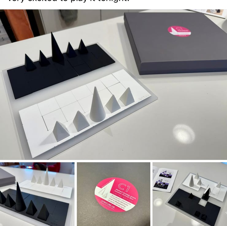 I have been making Perspex furniture and lighting for many years, so the first C1 game boards were made from Perspex only. New versions will be added to the list below, and photos will follow. Please feel free to email me (C1 at lumicube.uk) if you have any queries, about the materials or the game itself. International reviews of C1 and my other games can be viewed at BoardGameGeek.com