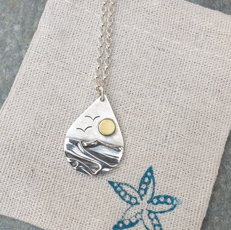 Inspired by my love of the beautiful Norfolk coast. This teardrop shaped pendant is handmade in sterling silver with a layer of folded fine silver to represent the sea. The sun is made from brass and has 2 stamped seagulls flying in the wind. The pendant has been oxidised to give the effect of a hazy sky. It measures approx 30mm top to bottom and 22mm across at it's widest point and comes complete with a sterling silver belcher chain which fastens with a bolt clasp. Due to the techniques used in making them, each of these folded silver pendants is unique.