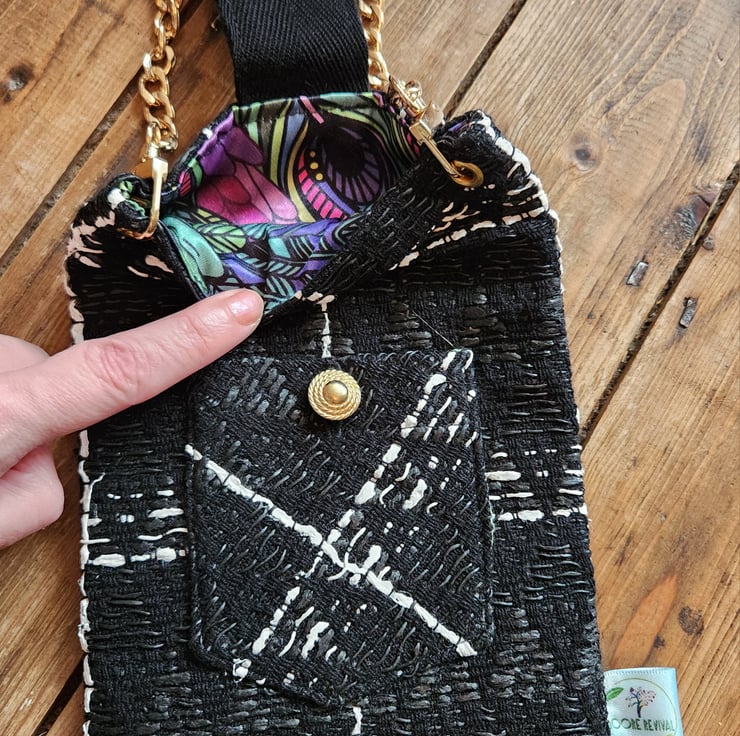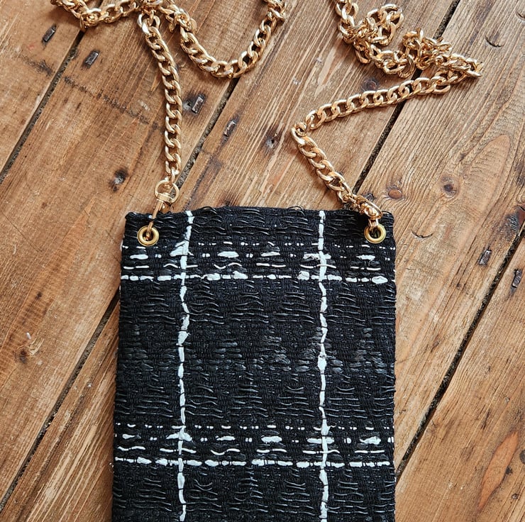Sustainable, sophisticated and singular. A statement in texture and tone, this black and ivory bouclé phone carrier brings couture to your everyday. The front pocket, adorned with a gold button, adds a touch of vintage elegance, while the long detachable gold chain lets you wear it across your body for security.