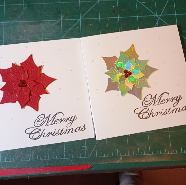 A pack of 4 Christmas cards same design. 2 red, 2silver. Completely handmade and unique design. Consisting of pristine white card which has a die cut poinsettia mounted. Embellished with red rhinestones and merry Christmas he and stamped