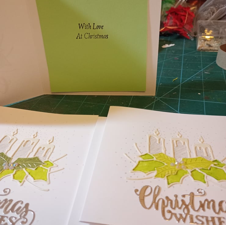 Pack of 5 candle cards. All completely handmade and unique design. Consisting of pristine white card with candles die cut and mounted . Water coloured and finished off with silver beads and festive greeting