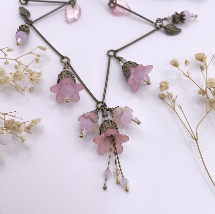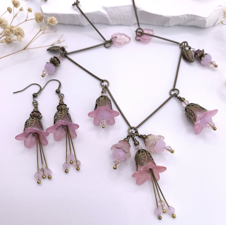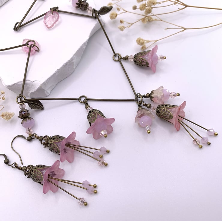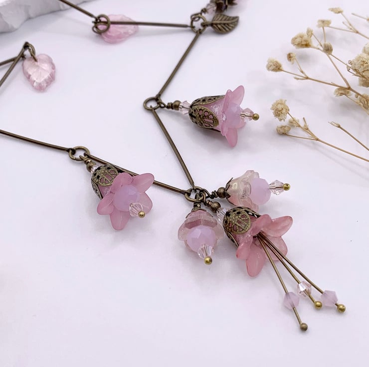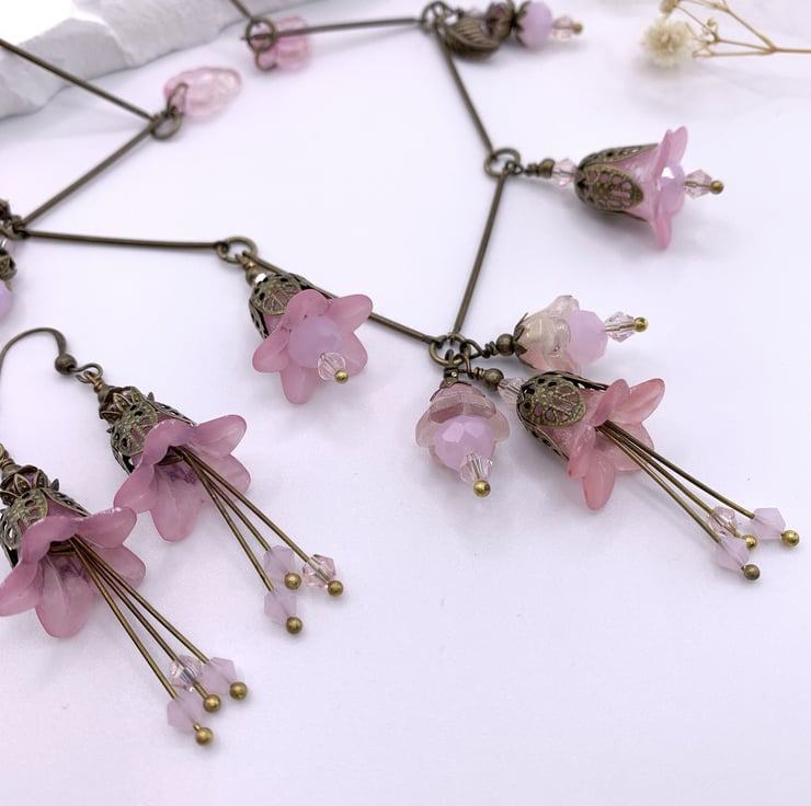 This really pretty necklace and earrings set is made in an Art Nouveau style. The necklace comprises hand painted pink lucite flower beads and pink glass flower beads.The flower beads are topped with antique gold tone filigree bead caps and glass crystal drop beads . The necklace also includes tiny pink glass leaf charms and the main central feature flower has long flower stamens that move when the necklace is worn. The chain part is made with bronze tone links and is finished with a lobster fastening. The set is completed with a pair of matching earrings that also have long glass bead decorated stamens.