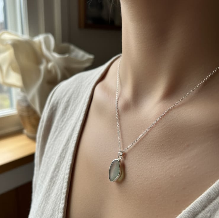 - Handmade sterling silver necklace with recycled sea glass found along the Dorset coastline