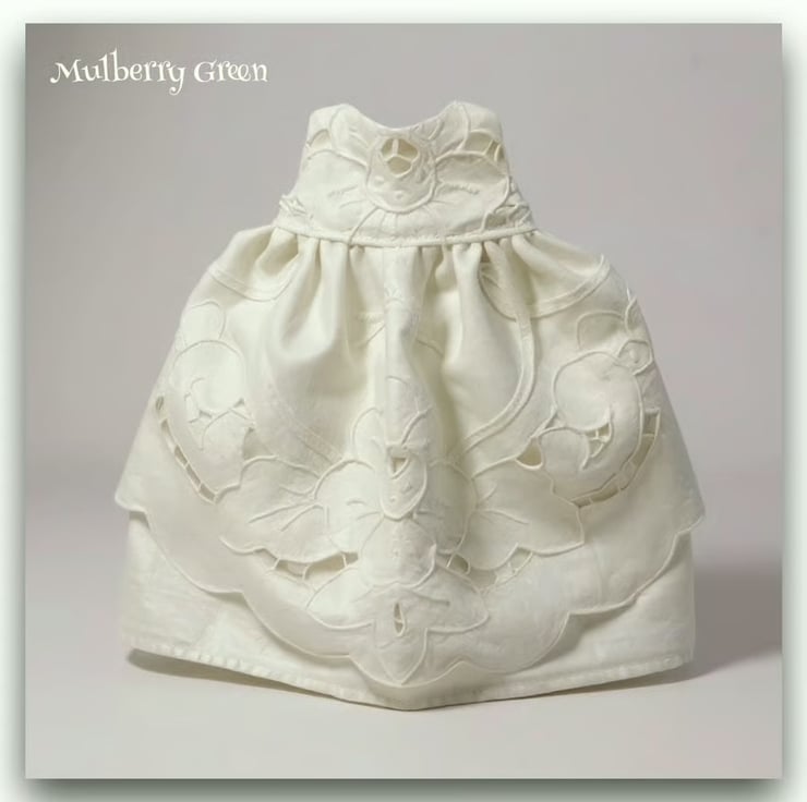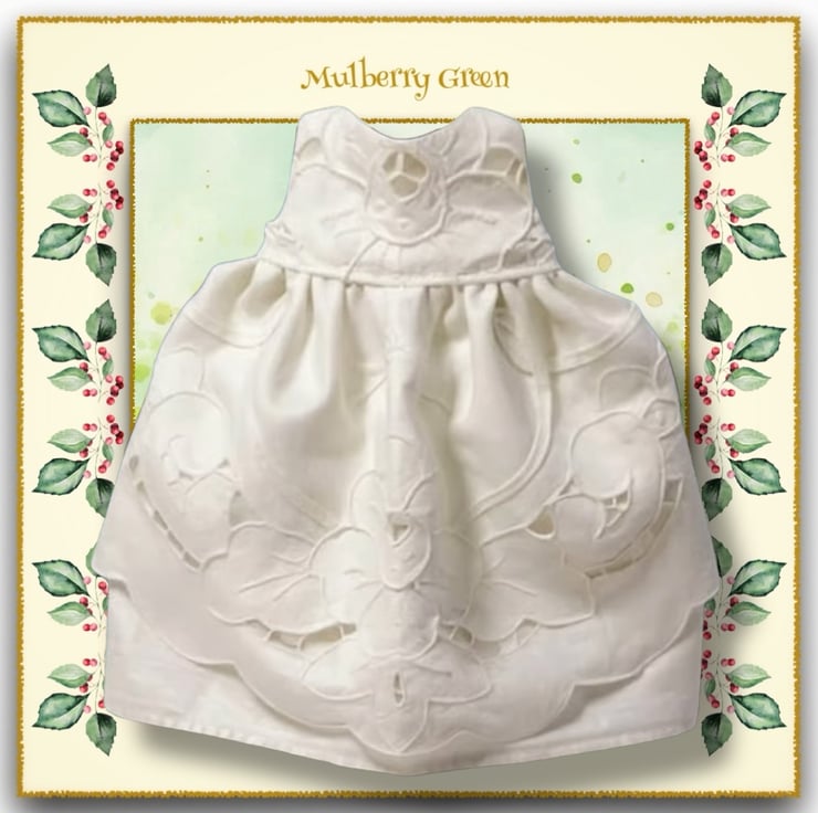 A really beautiful full length dress, in pure white cotton, to fit the Mulberry Green characters. The dress has a cutwork apron front and a lined bodice.