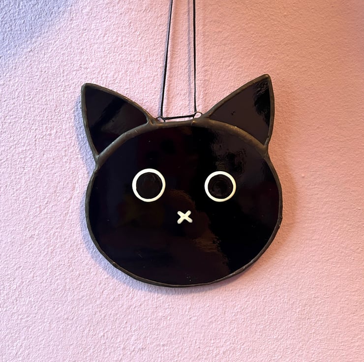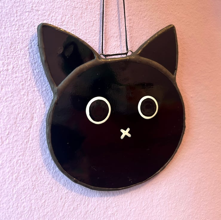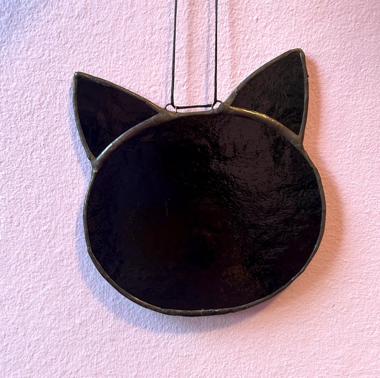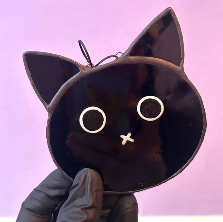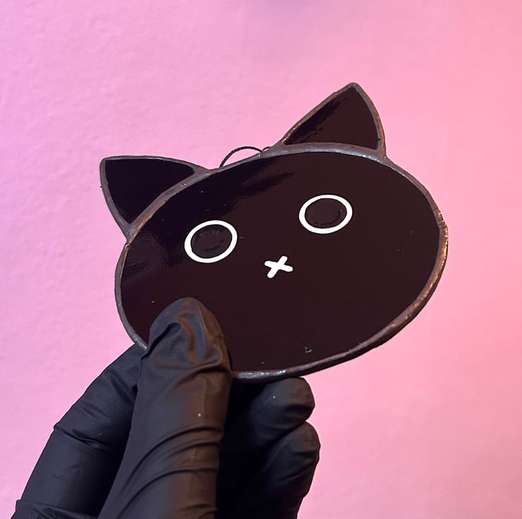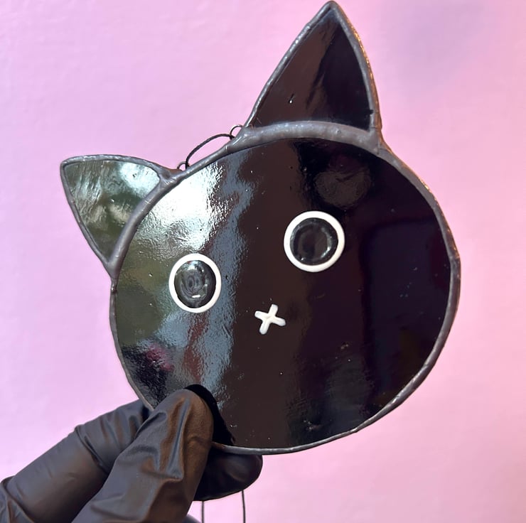 This black stained glass cat is full of charm with a hint of witchy magic. Handmade with sleek opaque glass and finished with hand painted facial features that give it a playful personality. Perfect for cat lovers, Halloween fans, or anyone who loves a little spooky sweetness in their decor.