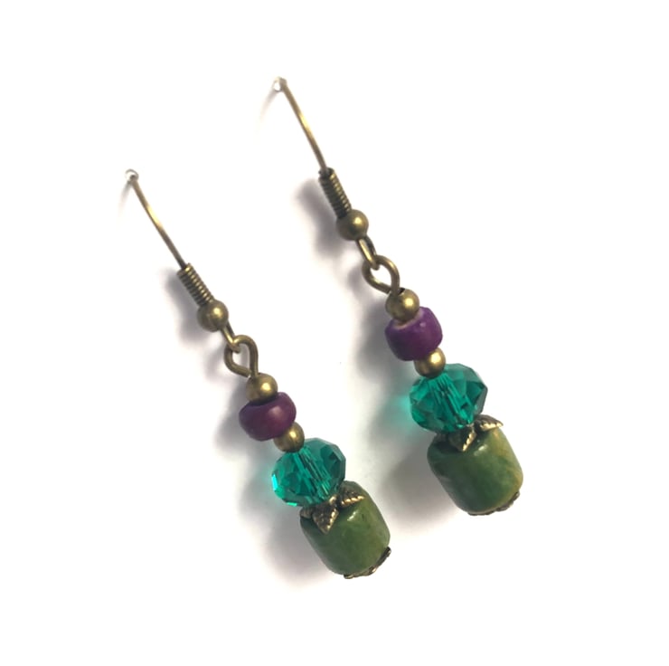 Green jade green purple brass effect boho style dangle drop bead earrings handmade by me using up-cycled and shop brought beads.