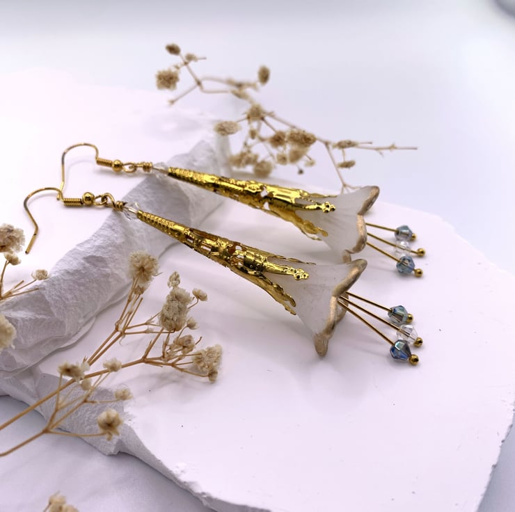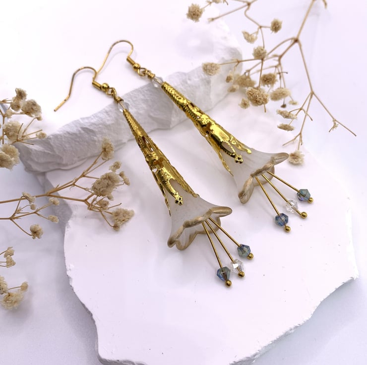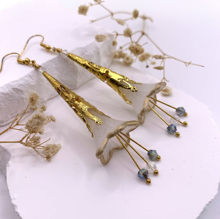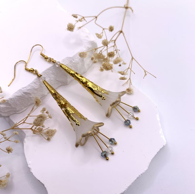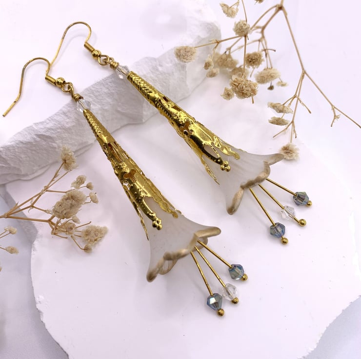 These charming earrings are made with white lucite flower beads that are hand painted with gold around the edge and are embellished with gold plated long bead caps. The earrings also have long drop stamens with tiny pale blue tone glass beads that move when the earrings are worn. The earrings are finished with gold plated ear wires and they are 8cm in total length.