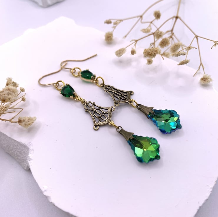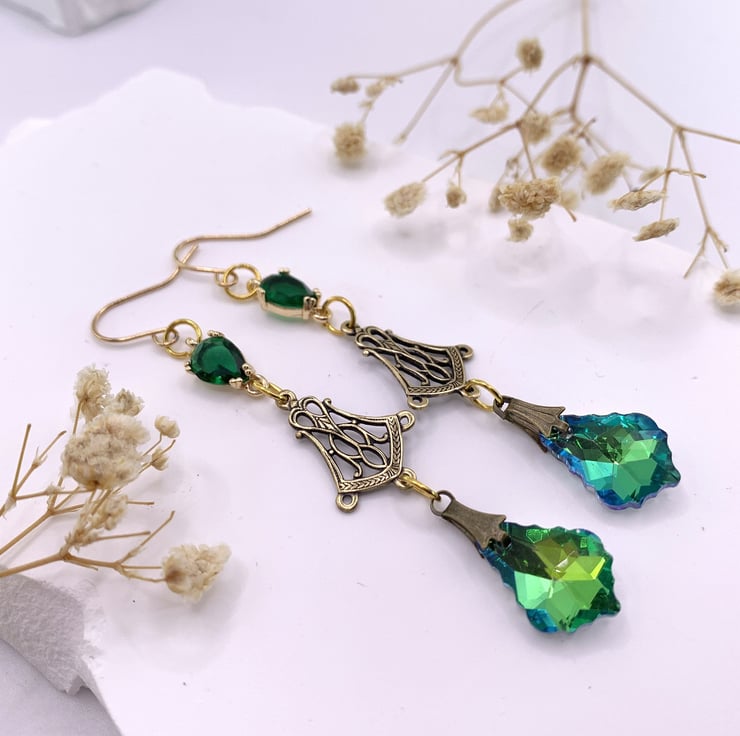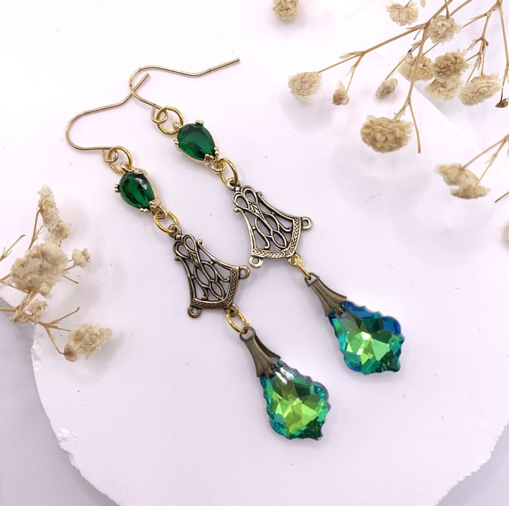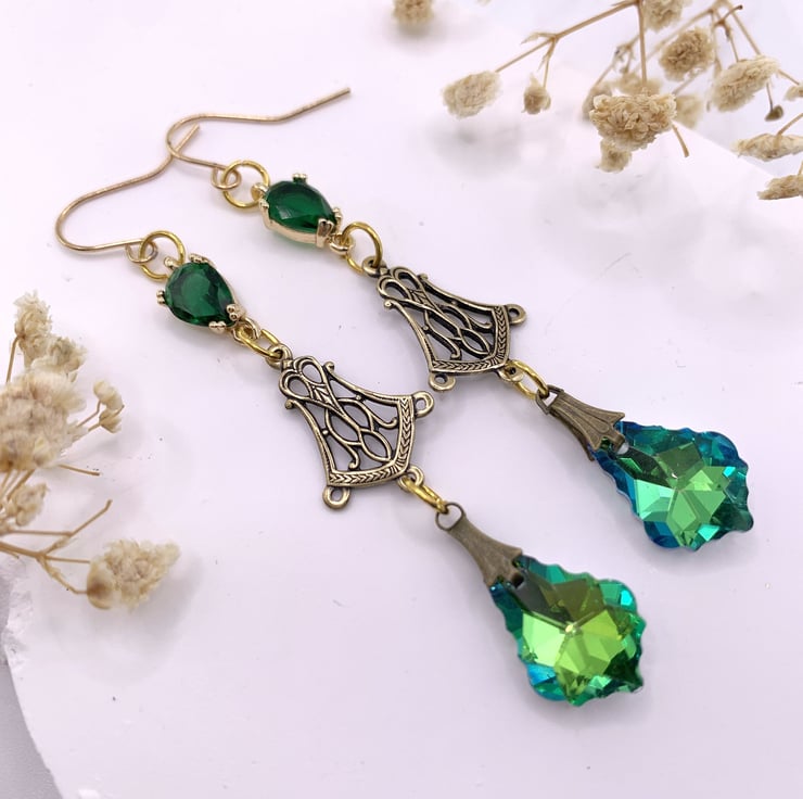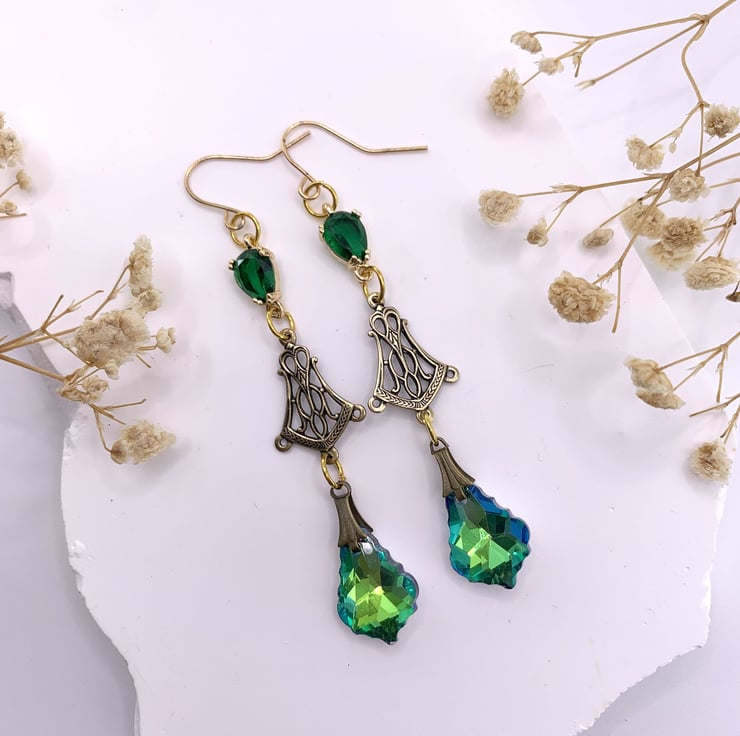 These charming vintage style earrings are made with antique gold-plated Art Nouveau style connectors with emerald green glass crystal drop charms and green connector charms. The earrings are finished with gold-plated ear wires.. The finished length of the earring is 6cm.