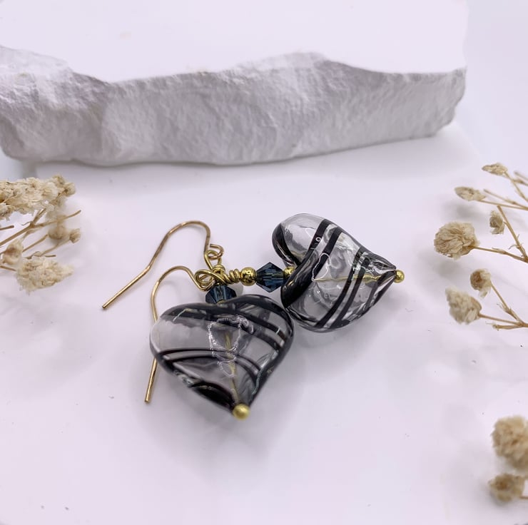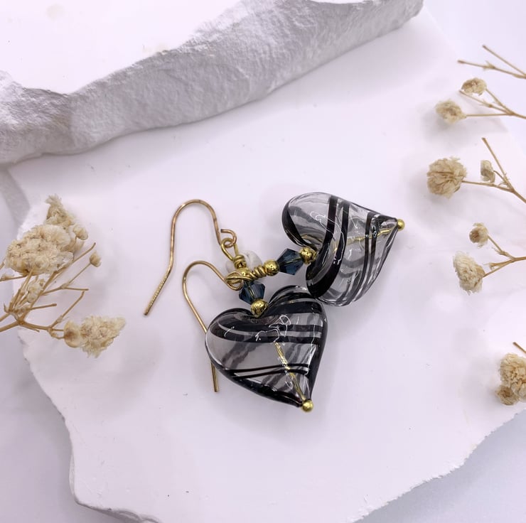 These eye-catching earrings are made with handmade patterned hollow lampwork glass heart beads that have black striped patterns running round the bead. They are topped with gold plated beads and finished with gold plated earring hooks.The earrings are 4cm long in total.