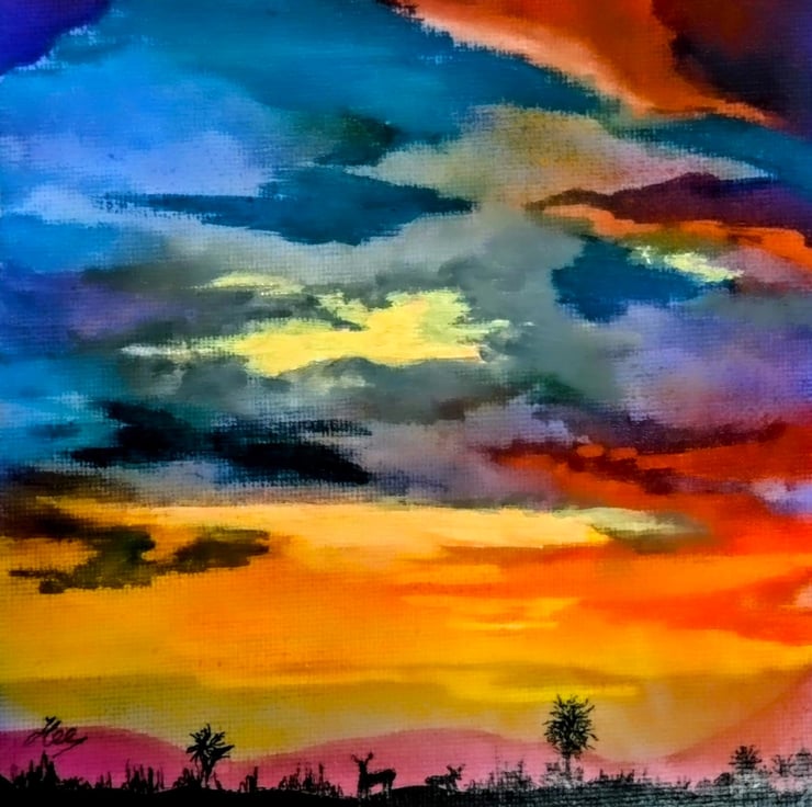 I love experimenting with colour, and really liked the contrast between the vivid sunset and the deeply shadowed trees and animals at the bottom of the picture. Originally intended to be presented on a wooden stand, it became clear that wasn't an option once I had finished the painting, as the Deer and the trees were too near the edge! My fantastic framer has worked her magic and the entire painting is visible in the frame. I think the gold colour really complements the colours in the painting. It would make a nice pop of colour on any wall.