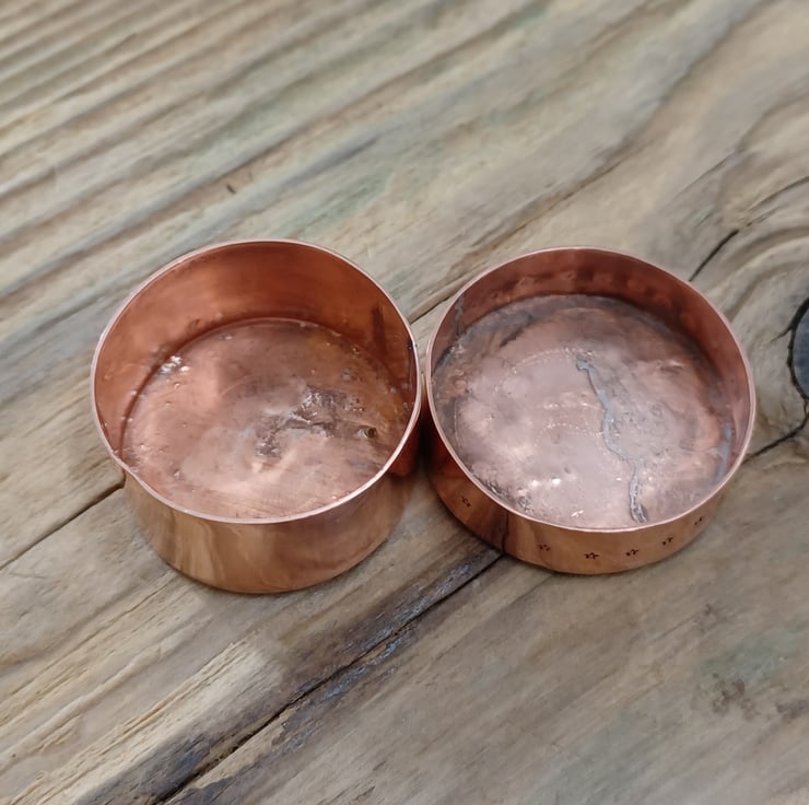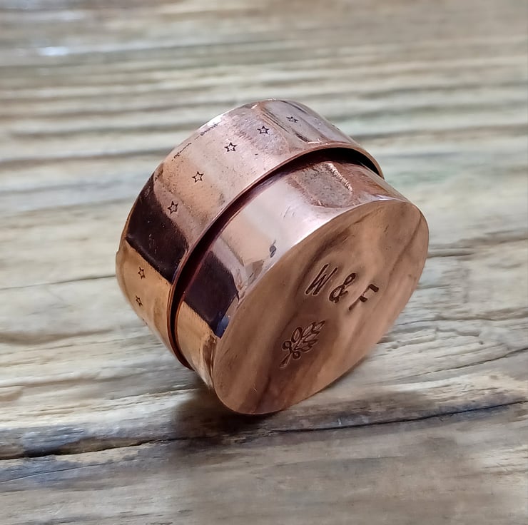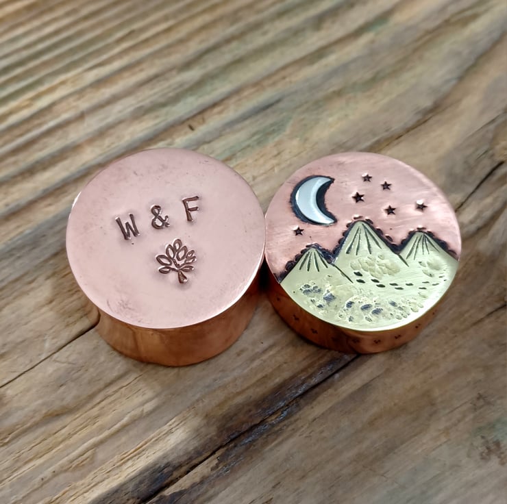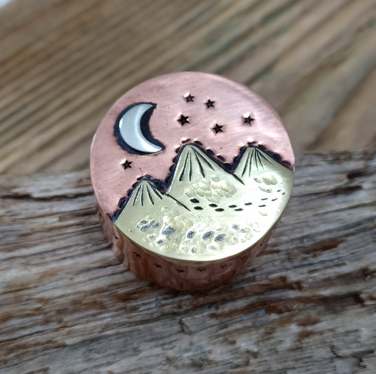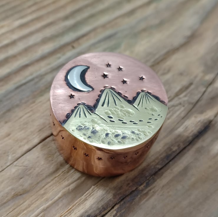 Made from copper, brass and silver sheet . This delightful mini box could be a place to store any little keepsakes or just as a collectable. It has been hand sawn, soldered ,filed , sanded and polished. A mountain scene has been soldered and stamped onto the lid.