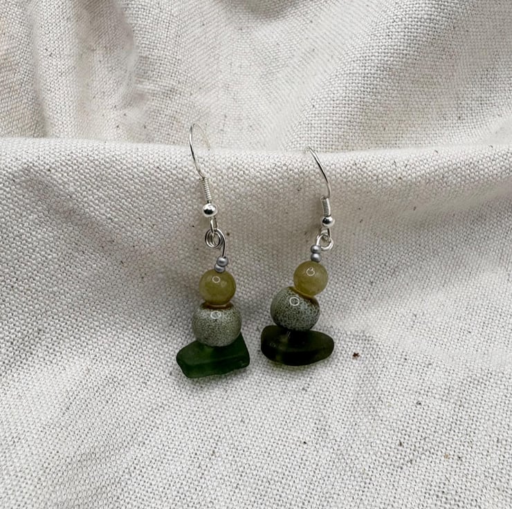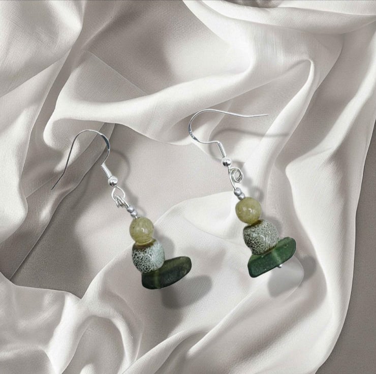 They have been carefully drilled with complimentary green beads. I try to match and pair up my earrings as best I can. They have stamped 925 Sterling Silver earring wires.