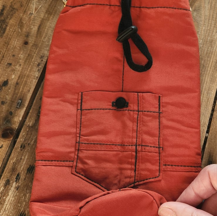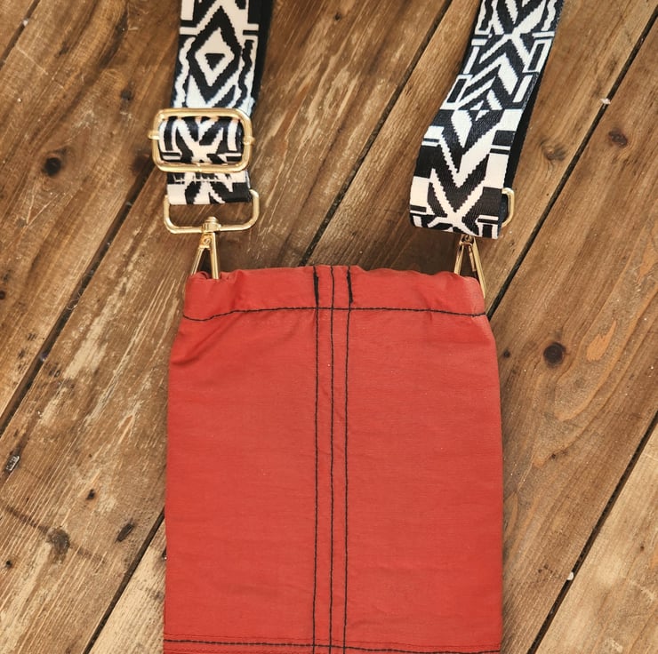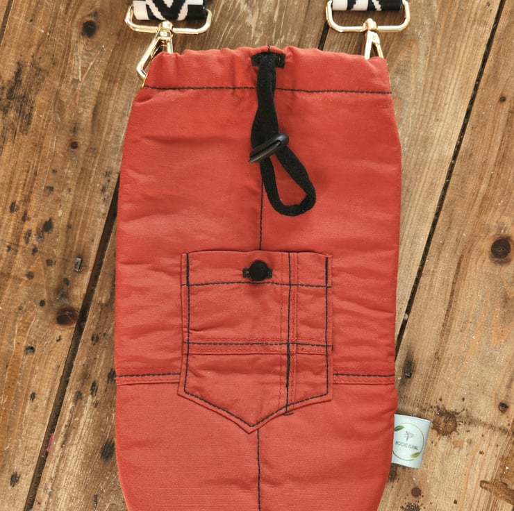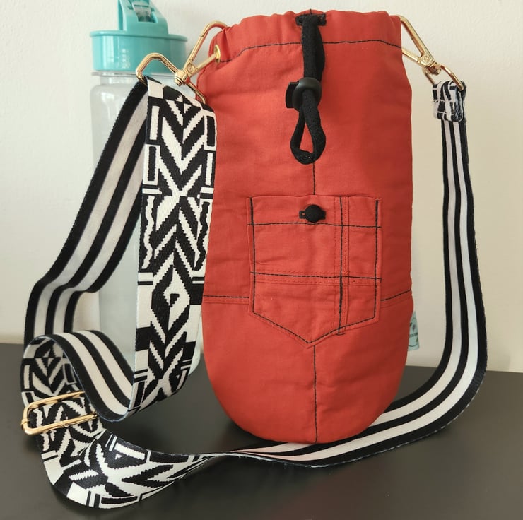 Be as cool as your water is with this one of a kind crossbody water cooler. Handmade from upcycled trousers in rich burnt orange, it features a front buttoned pocket, a detachable black and white adjustable strap, and fits a 1L bottle — keeping your drink cool for up to two hours. Sustainable, functional, and effortlessly unique, this will keep you cool wherever you go.