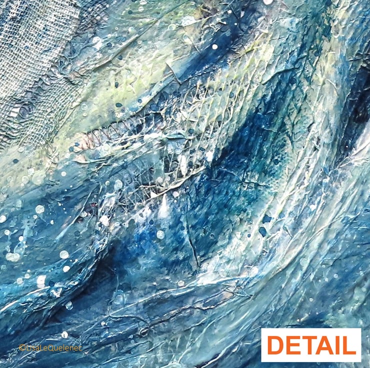 'On the Brink' abstract mixed media textured marine acrylic and ink painting in deep blues and cream depicting a breaking ocean wave.