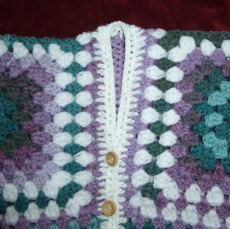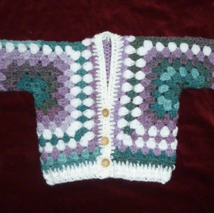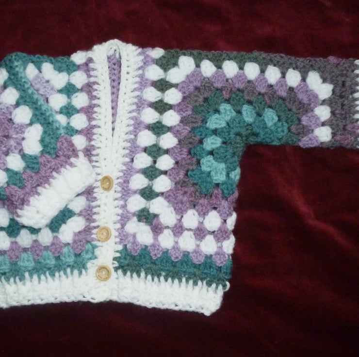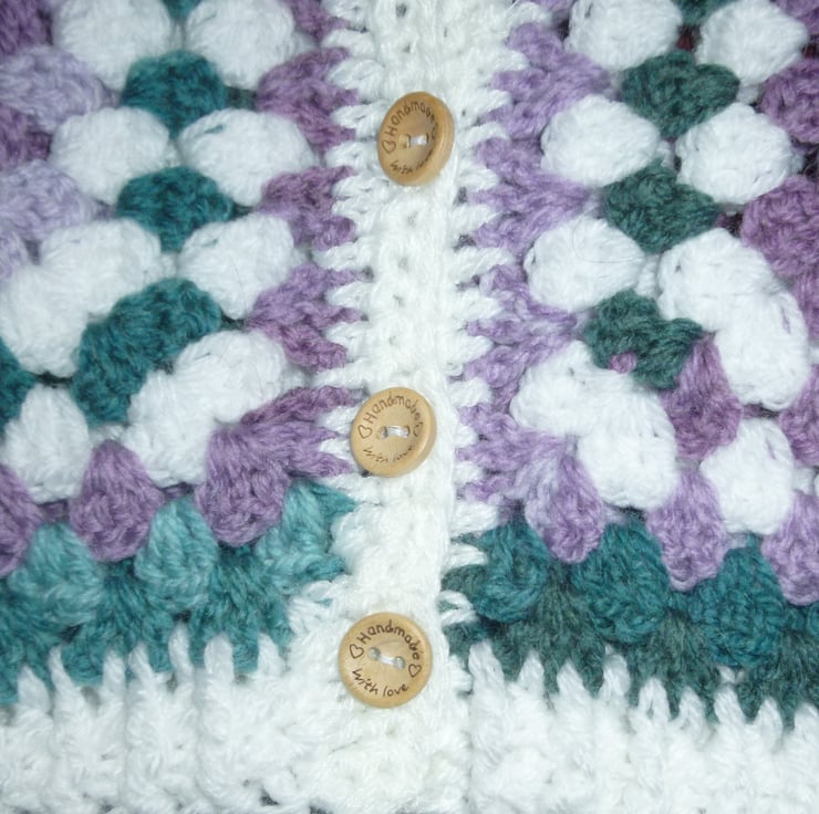This pretty baby hexagon cardigan has been crocheted with a pretty mix of colours.