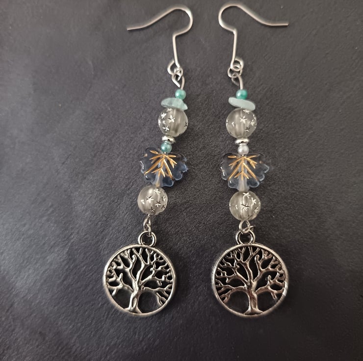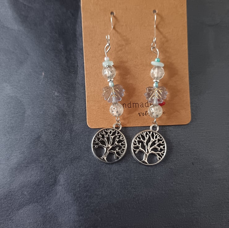 These handmade earrings are crafted with stainless steel hooks, sterling silver tree of life charms and an assortment of different sized beads in pastel colours. Blue leaf beads give this piece a frosty look and contributes to the wintry, nature-inspired vibes.