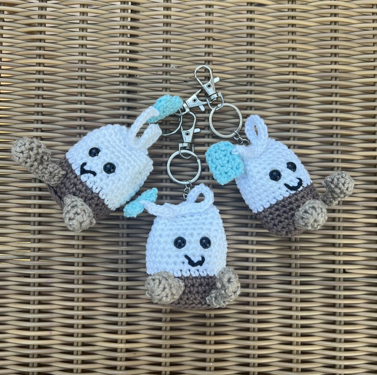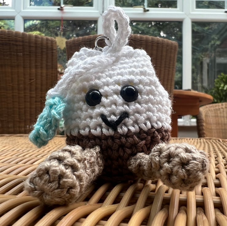 Handmade crochet bag charm, with cotton yarn, with a cute face and little legs, the ideal friend for your bag or keys. For the avid tea drinker in your life.