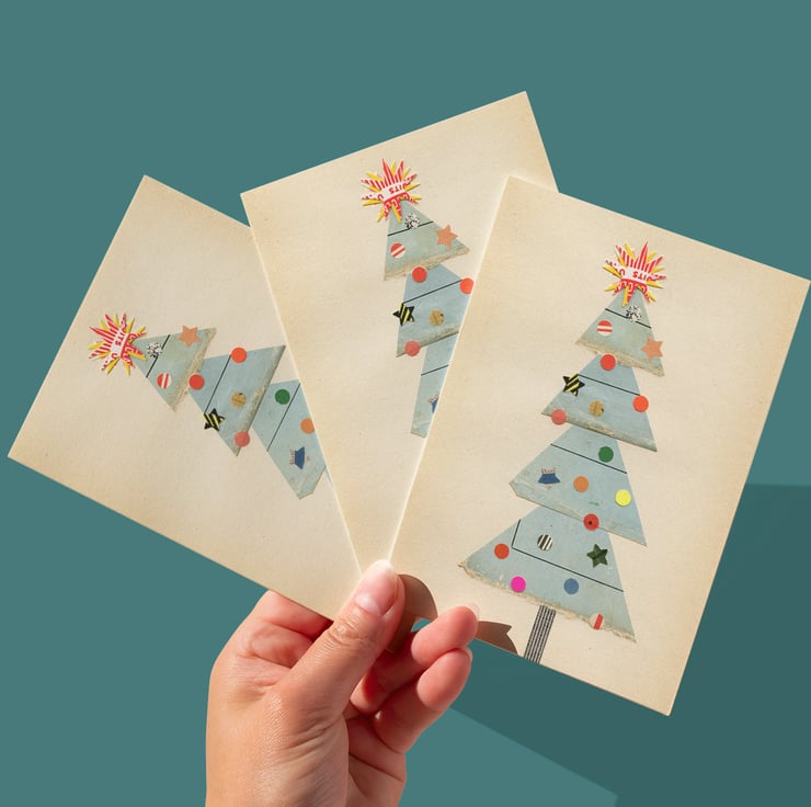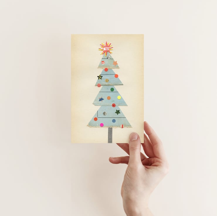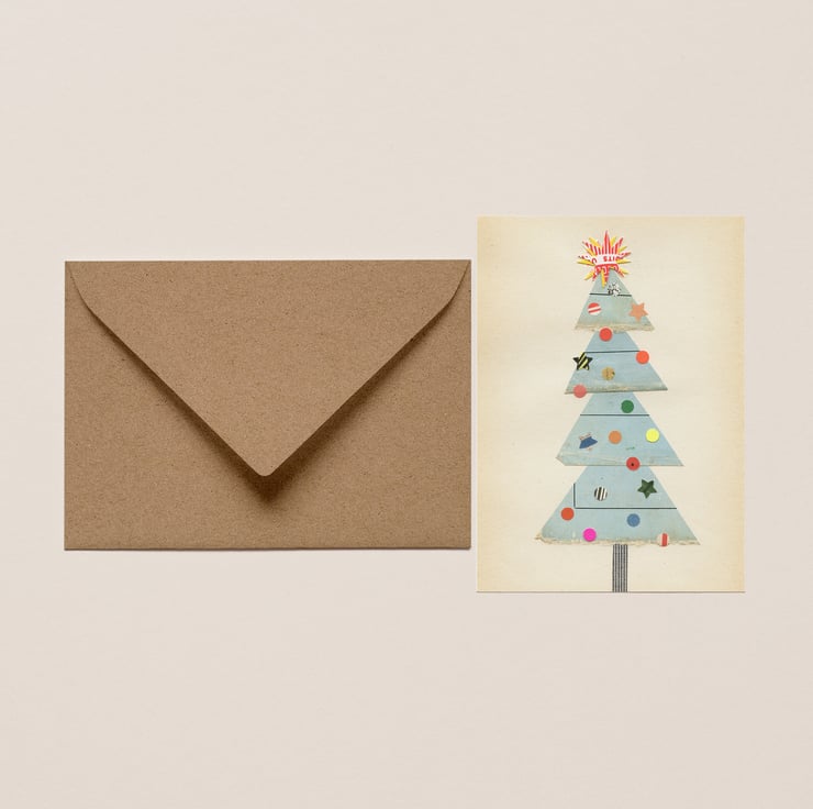 A charming Christmas card featuring a cute wonky tree with an eclectic collection of baubles and the brightest star on top.