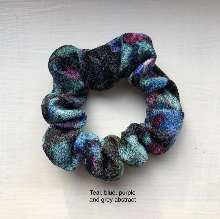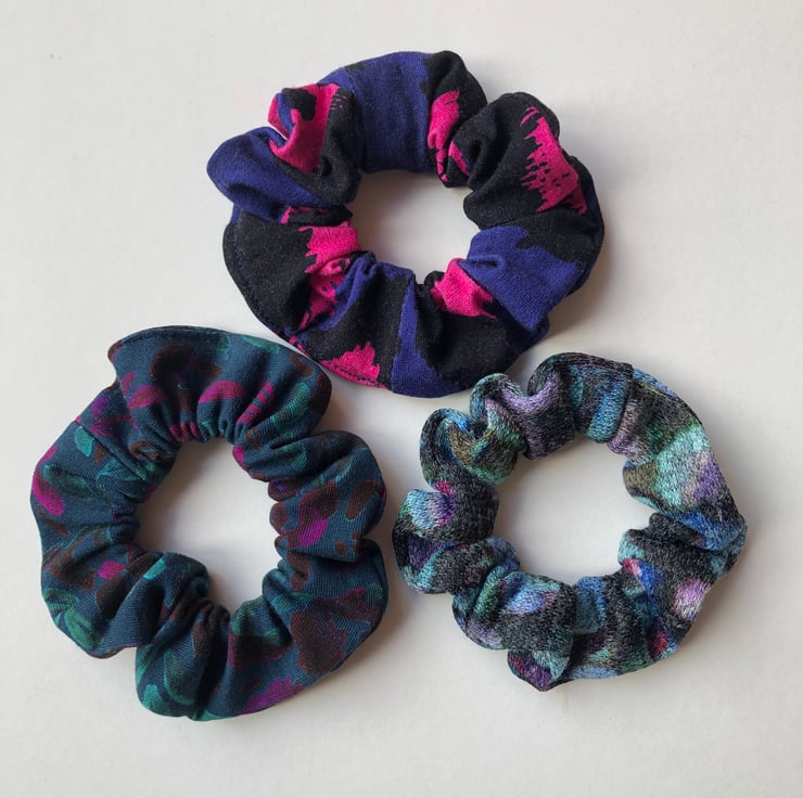 Handmade upcycled soft hair scrunchies in purple, pink and teal fabric