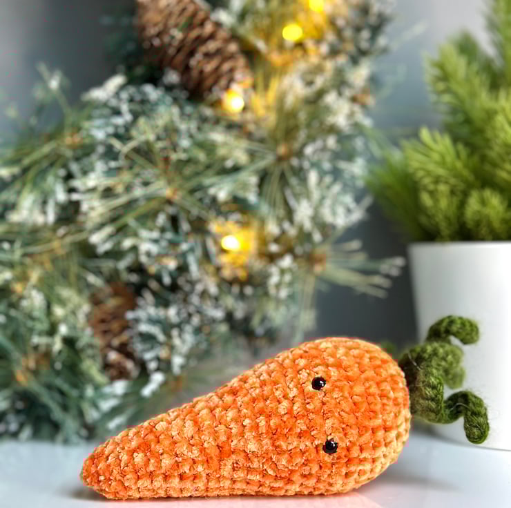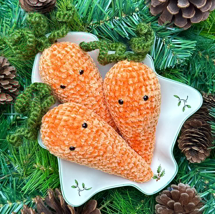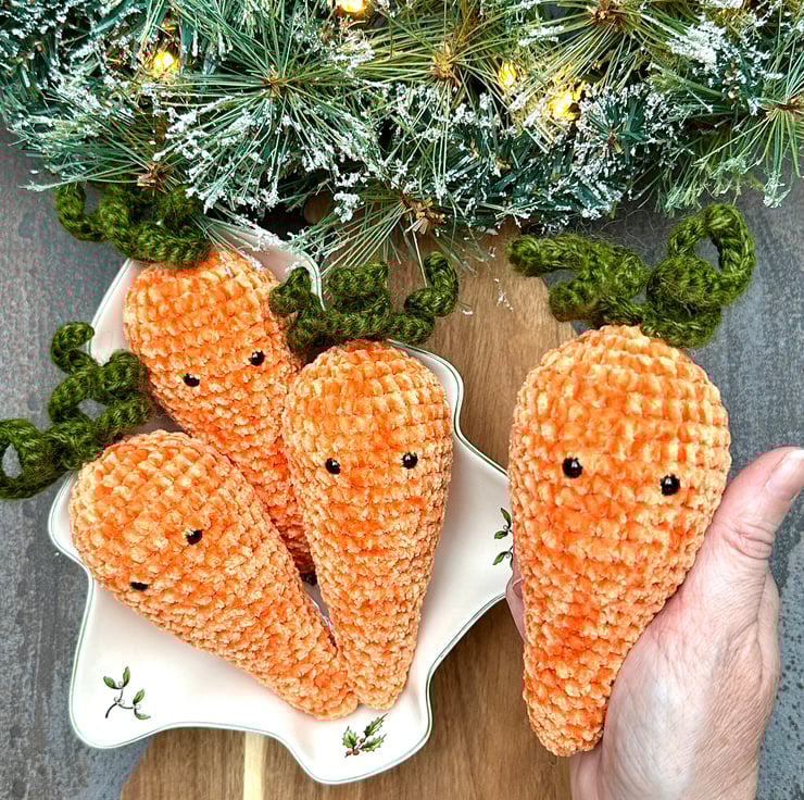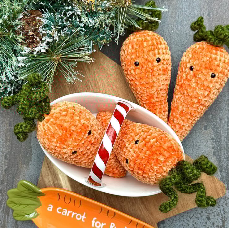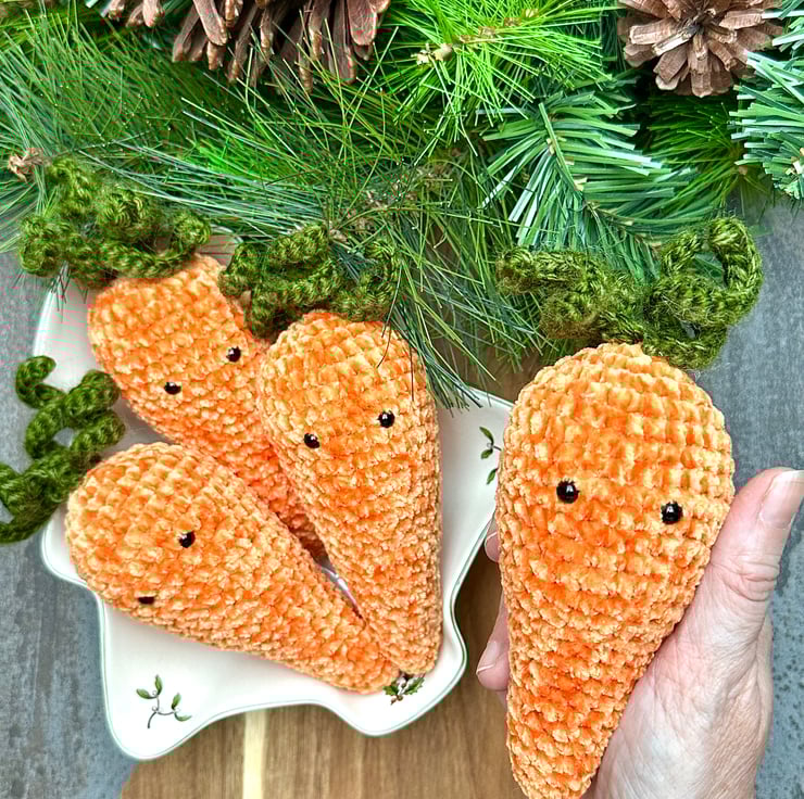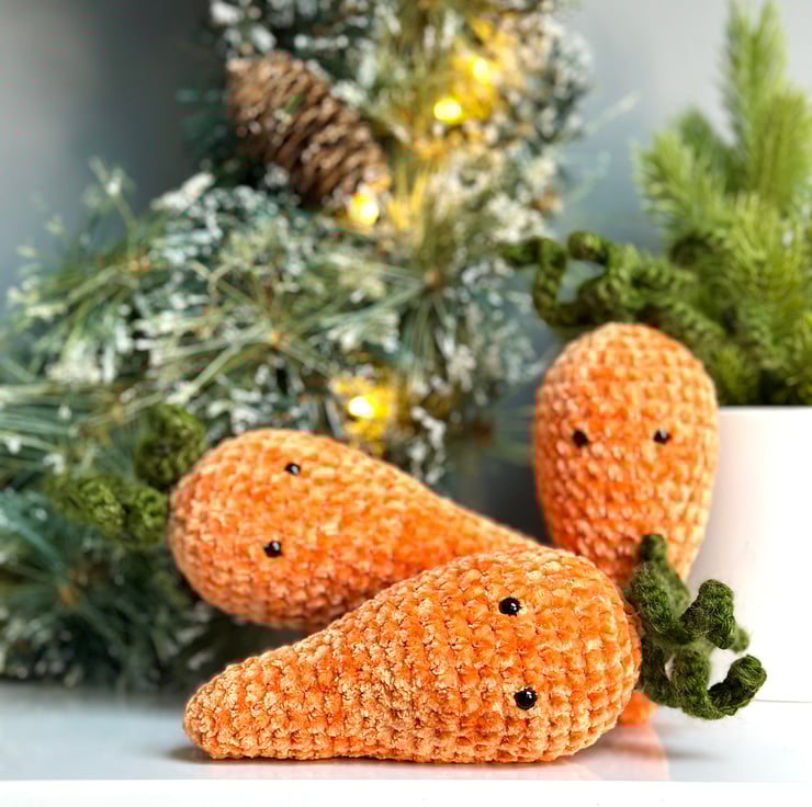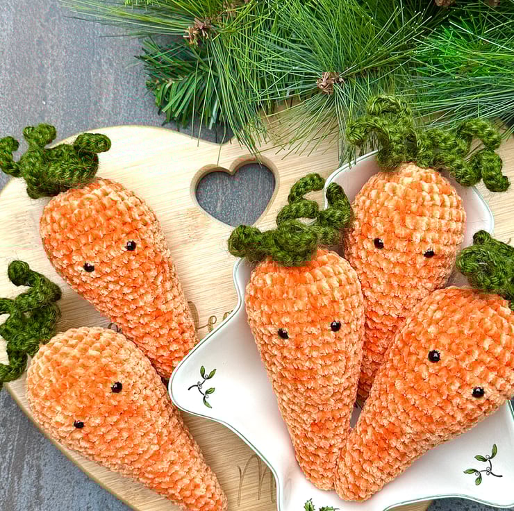 Each individual carrot is finished in a vibrant orange chenille yarn and measures approximately 15cm by 6cm.