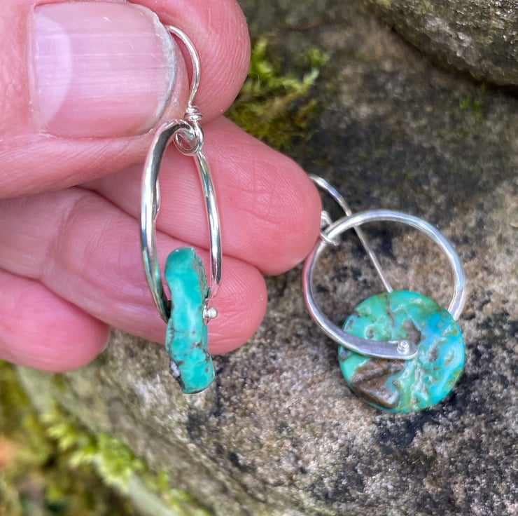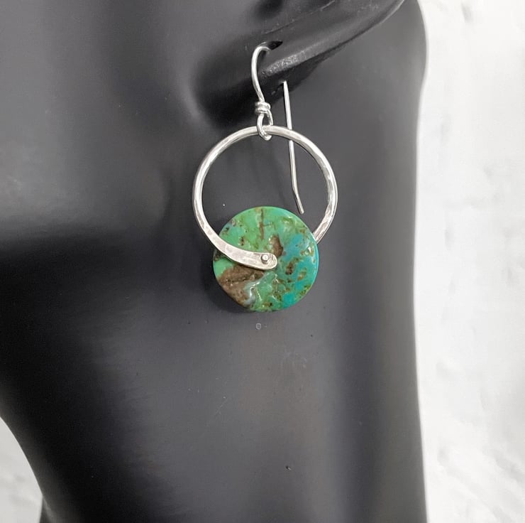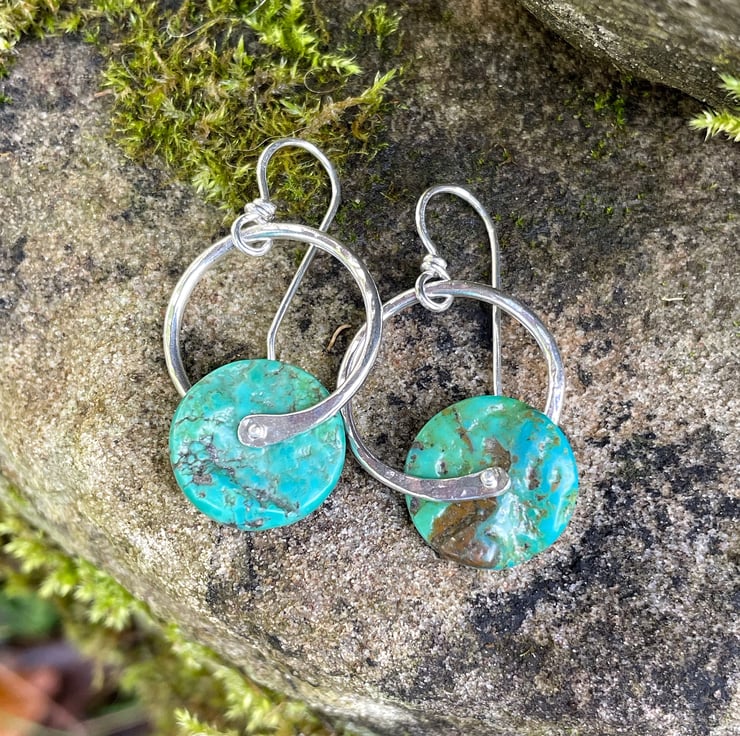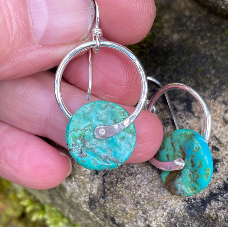 Big hand-cut turquoise disc beads are held in a textured ring of sterling silver and hung from handmade hooks.