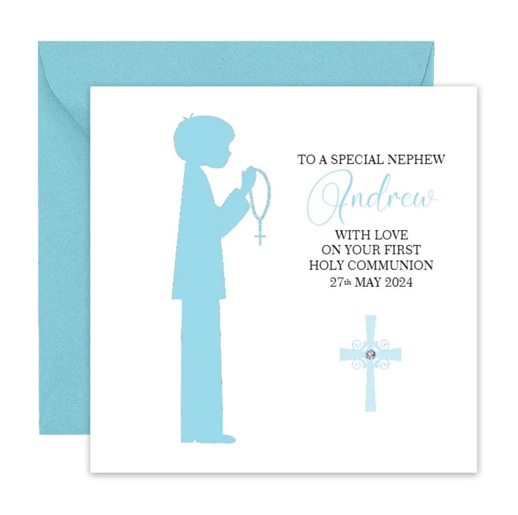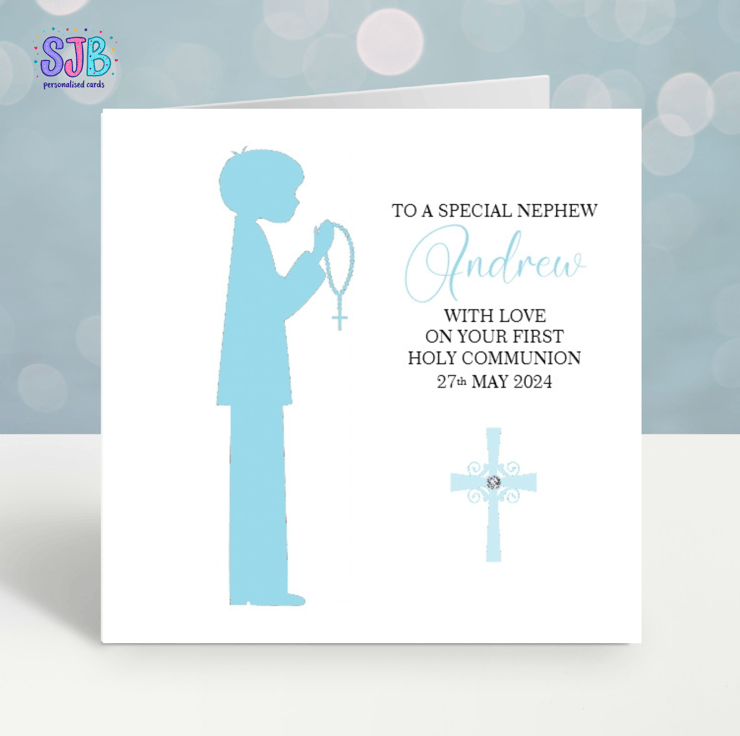 A handmade personalised Holy Communion card, finished with a silver diamanté on the cross.