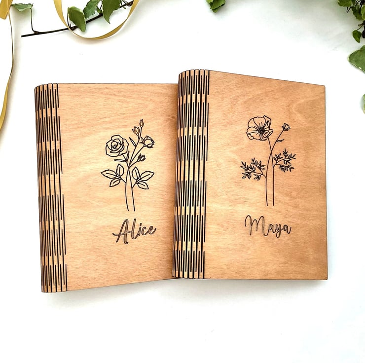 Engraved Wooden A6 Notebook – Birth Flower Design, Personalised Gift